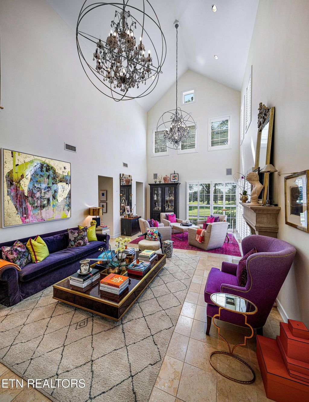 hardwood flooring and staircase, enhancing the home's warm yet sophisticated aesthetic. Towering vaulted ceilings soar to 26' in the great room, 20' in the primary suite, and 16' in the entrance foyer, and 9' ceilings on the second level.