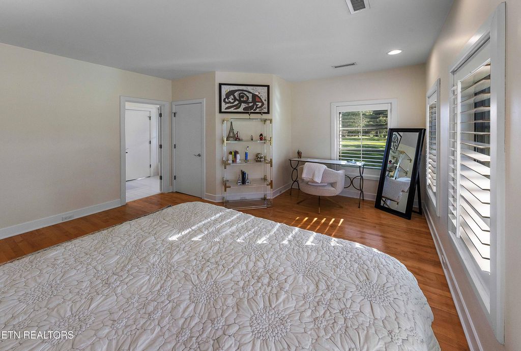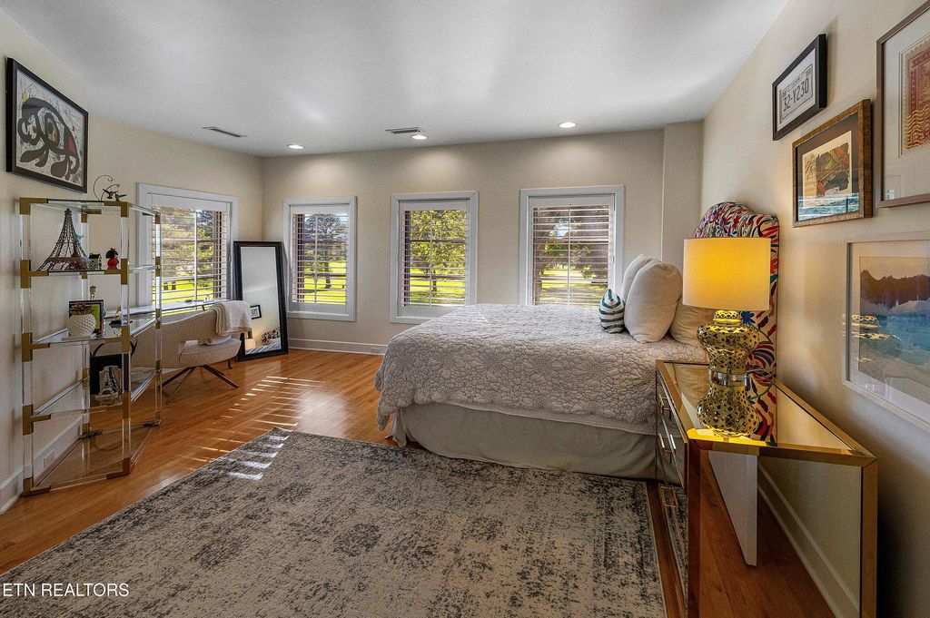 This Architect-Designed Modern Home sits on .82/Acres ~ Golf Front Lot in Fox Den with over 237' of golf course frontage in the heart of Farragut! Privately positioned on the 18th fairway of Fox Den Country Club, this all brick, 4-bedroom,3 & half bathroom residence spans 4,442 sqft, featuring queen-sized brick construction for timeless durability and elegance. Designed with 14 gables, this residence boasts custom copper gutters and Kolbe 8' windows, offering gorgeous panoramic views of the 18th, 10th, and 9th fairways, the driving range, the clubhouse, and the lake on 18. The limestone floors complement the maple