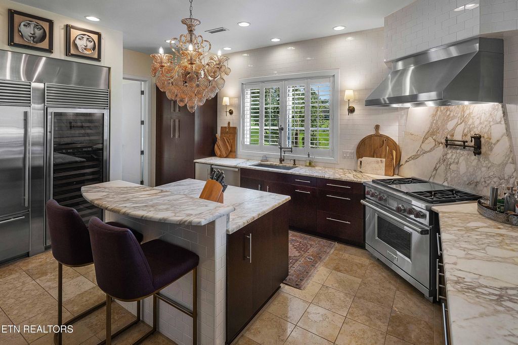 stand-alone soaking tub, and an unbelievable custom master closet with custom shelving and cabinetry throughout, offering generous storage and organization. Also contiguous to Primary Suite is a Workout Room or Office Space. The Chef's Kitchen is a dream, designed with marble countertops, two breakfast bars, a Wolf gas range/grill/oven, a Sub-Zero refrigerator, a 96-bottle wine cooler,