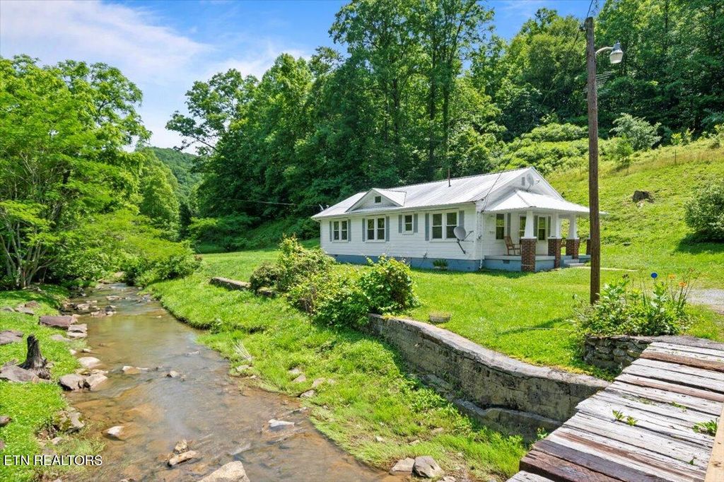 Looking for a quiet mountain home sitting creek side with a front porch, over an acre of land, and direct ATV trail access? As you pull up to this home, you will drive across a wooden bridge and find three outdoor buildings (one used to be a quilting room for the community). Sitting on about 1.2 unrestricted acres, you have space to enjoy everything that country living offers. Both porches are covered for those swings and rocking chairs. The inside could use a coat of paint and a few updates, but the bones are great, including a metal roof and updated windows. The living room has lots of natural light and sits at the front of the house. Two bedrooms are pass through rooms, meaning you will go through them to access the back of the home where the dining room and kitchen are located. Also included is a canning house, perfect for storing those canned goods, with a playhouse upstairs. At this location, you can ride directly to ATV trails from the house without trailering. Hooked to city water. Buyer to verify all information, including but not limited to, square footage, acreage, restrictions, etc. Owner/agent