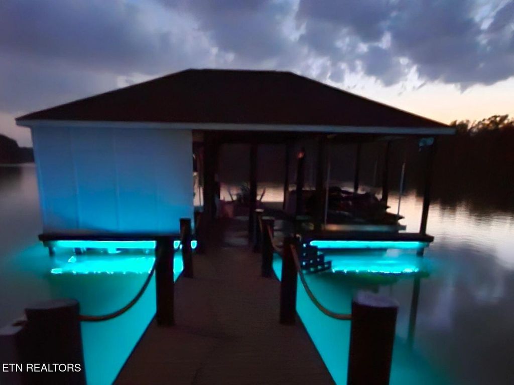 boat slip with in-ceiling 16,000 lb lift, double jet ski lift, premium lighting, sound system, under-dock ambiance lighting, and
