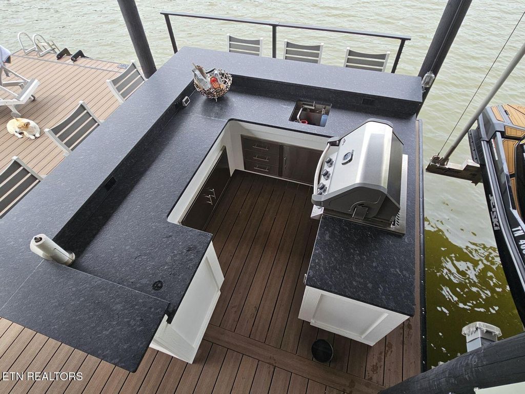 4K CCTV with remote access. Enjoy a custom lakeside kitchen, built-in grill, fresh water, drop-down 65″ TV, designer