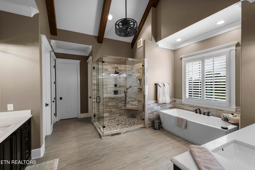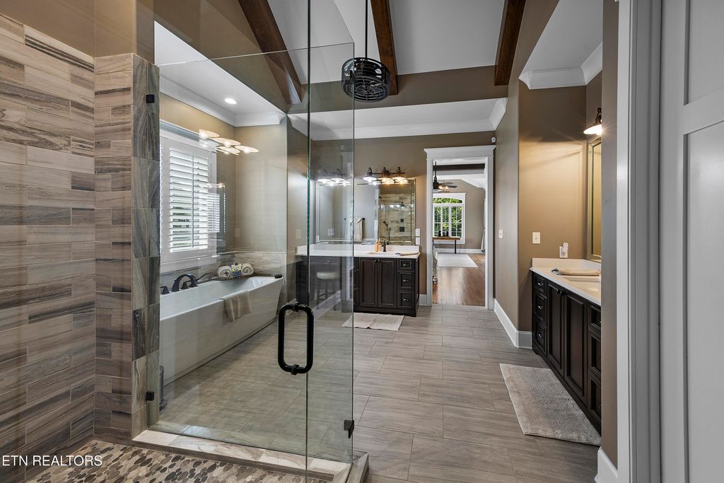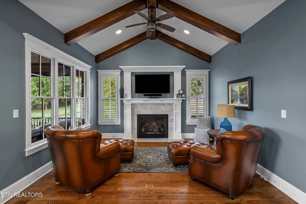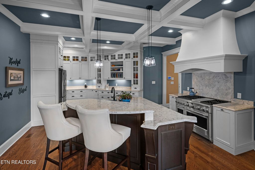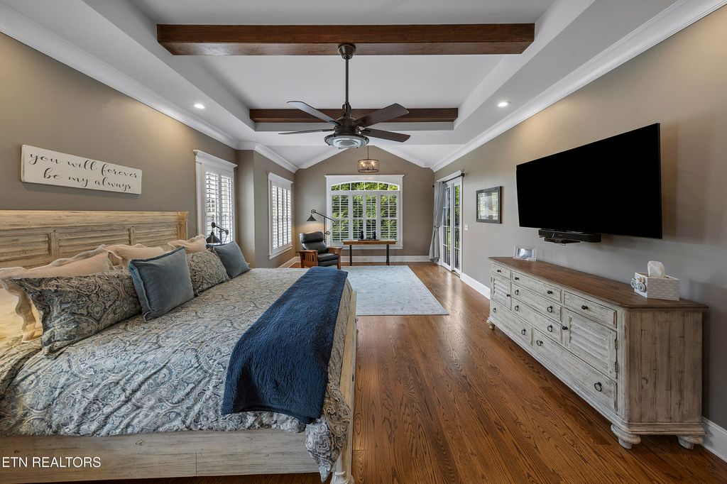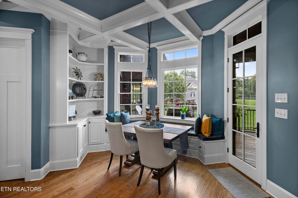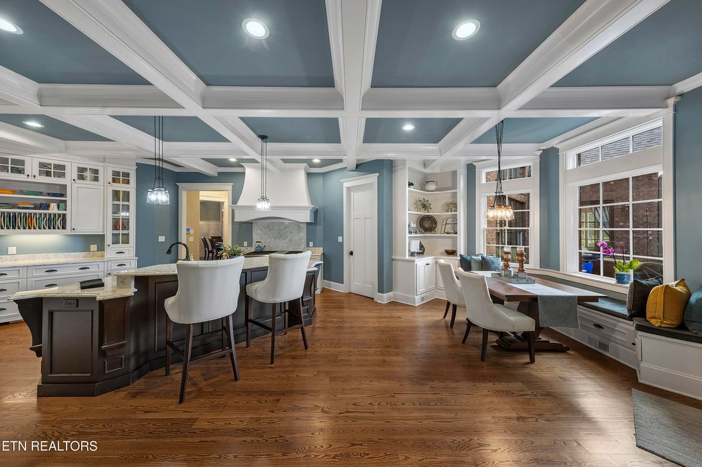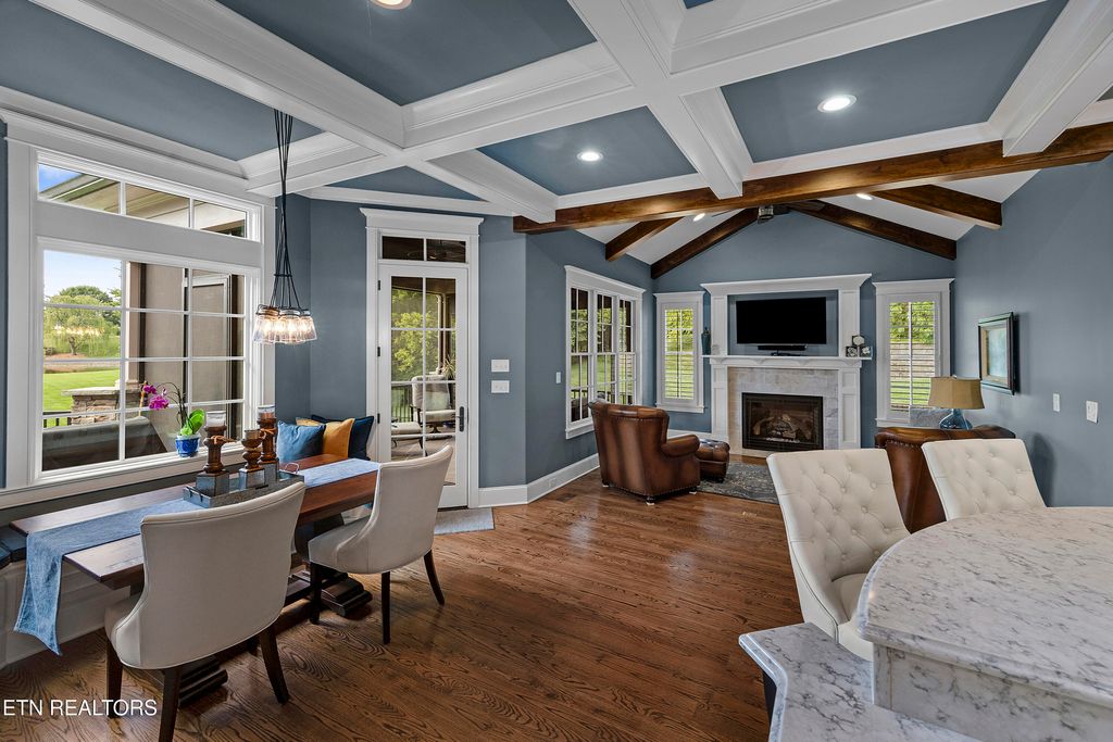 entrance foyer, you're welcomed by rich hardwood floors, soaring 10-foot ceilings & higher, elegant 8-foot doors, and plantation shutters that add timeless character. The main level showcases a formal Dining Room with deep coffered ceilings and extensive millwork, as well as a Great Room with dramatic A-frame ceilings, built-ins with barn doors, and architectural charm. The Chef's Kitchen is a dream, featuring coffered ceilings, a six-burner gas stove with griddle and double ovens, a spacious granite island with breakfast bar, drawer microwave, Wildwood double-stacked custom cabinets, and a pantry with wood shelving. It opens beautifully to a cozy Keeping Room with wood-beamed ceilings and a gas log fireplace. The plush Primary Suite is a true retreat, offering hardwood floors, a soaring beamed ceiling, a sitting area, and a stunning bathroom complete with A-frame ceilings, granite countertops, a soaking tub, dual custom closets, and a tiled walk-in shower. Also on the main level is a beautiful screened porch with T&G ceilings and Premium IPE Hardwood Decking overlooking the serene pool