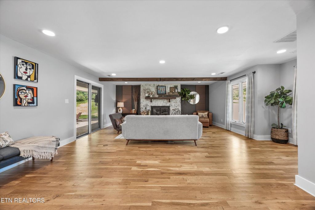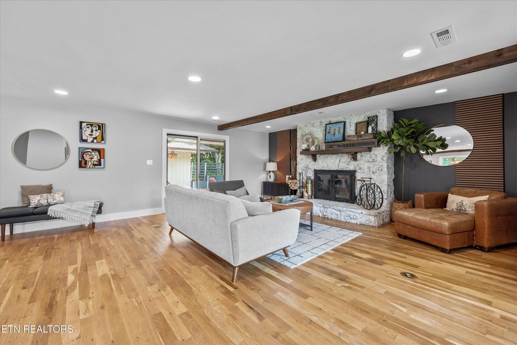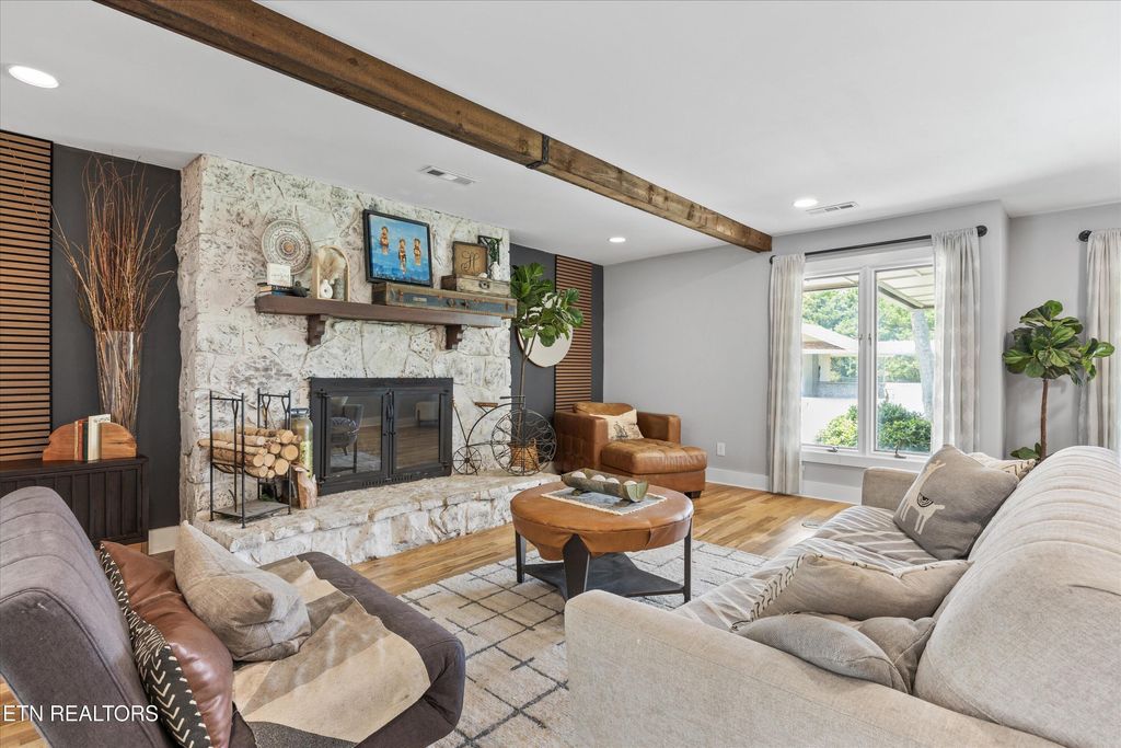 Inside, the home shines with modern sophistication: refinished hardwood floors, clean-lined finishes, and natural light that flows beautifully through open-concept spaces. A cozy, wood-burning fireplace anchors the main living area, creating a warm and inviting gathering spot year-round.