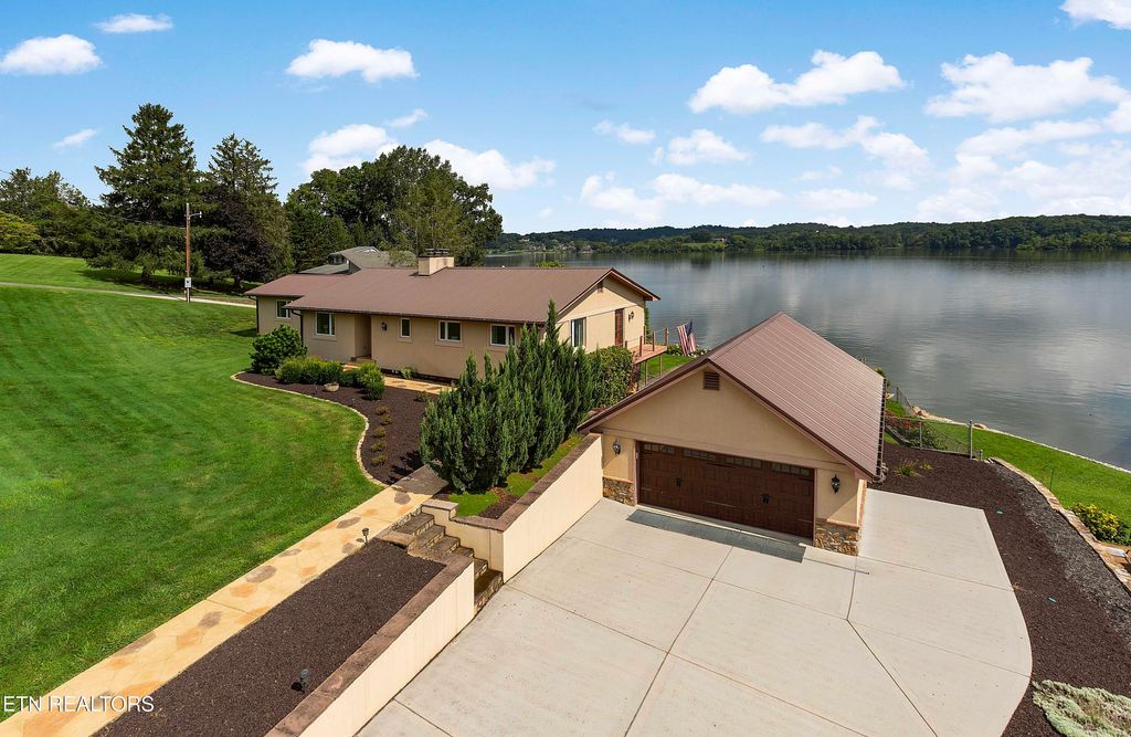 Indulge in panoramic views of the water and seasonal foliage from this waterfront home located on the Tennessee River. From the spacious dock with sundeck to the views of the water from the interior, this home offers peaceful year-round enjoyment. Stepping into the home, family and guests are greeted by an amazing view of the water and the lush hills of East Tennessee. A large floor to ceiling fireplace anchors the primary living space where access to the screened-in porch is mere steps away. Seamlessly attached is a formal dining space where happy occasions and holidays are to be celebrated. A spacious kitchen with breakfast bar, stainless appliances, ample counter space, glass front cabinetry and a large picture window with views of the water offers a lovely place for prepping meals. The primary suite is spacious with a tray ceiling and its lucky owners can wake each day looking out onto the water. A beautiful bath is attached with a walk-in shower, dual sinks, soaking tub and a walk-in closet with custom built-ins for shoes, bags and clothes. An additional spacious suite with an attached bath completes the primary level of this home. The lower level offers the remaining bedroom along with additional living space with a second stone fireplace, built-ins and a wet bar for serving snacks and drinks when company is over enjoying a day on the lake. A spacious upper patio is screened-in and allows the perfect space for outdoor dining, additional entertaining space, or a relaxing place to unwind at the end of a long summer day. The lower-level patio has covered and uncovered space and is surrounded by a lush lawn and tiered flowered beds leading down to a large dock with a boat lift plus a lower and upper sun deck. This waterfront home works for full-time residency or as a retreat from the norm and will provide memorable days and nights along the Tennessee River.