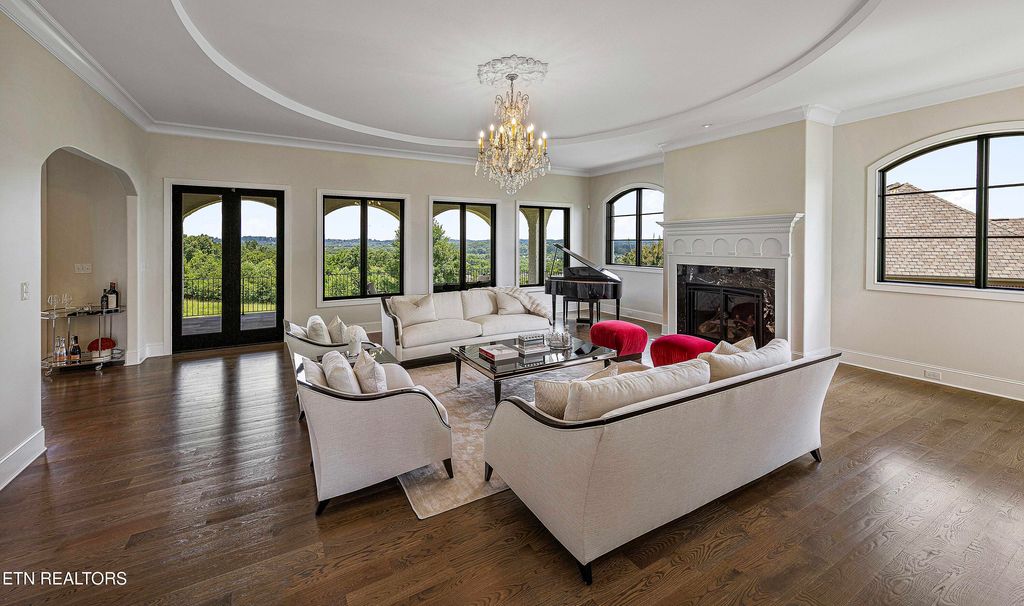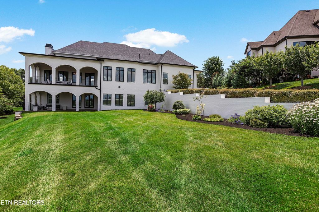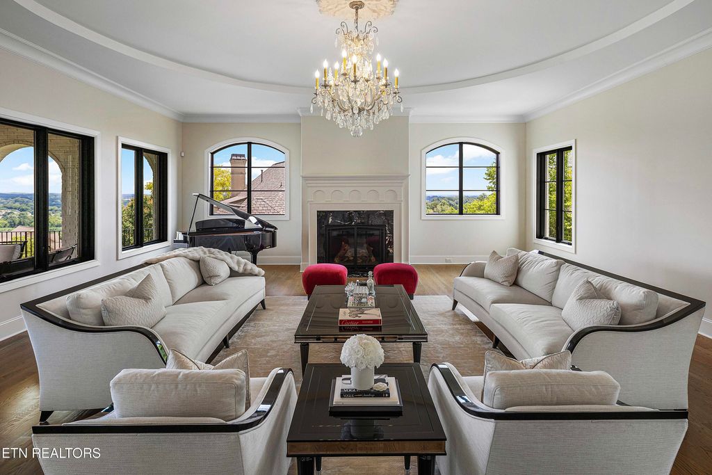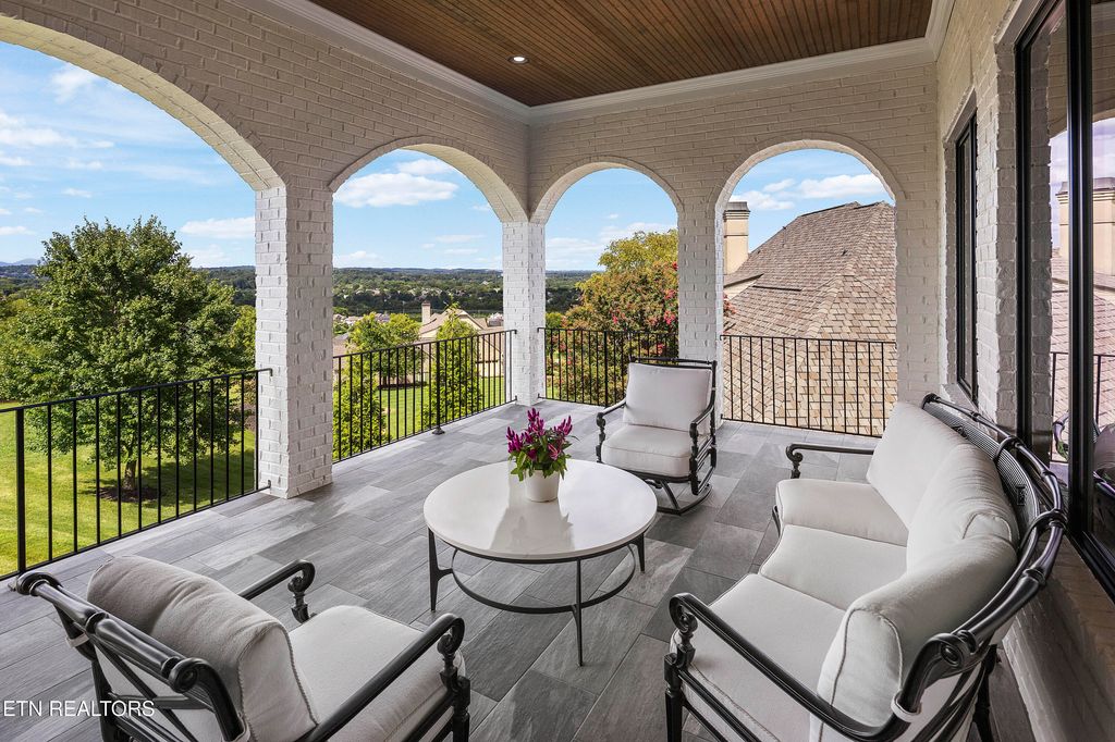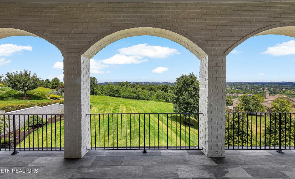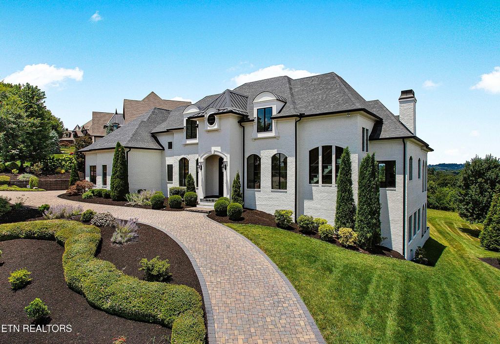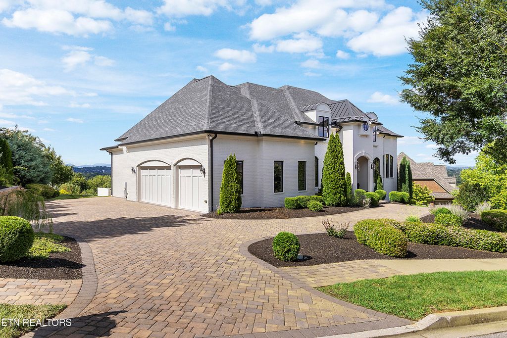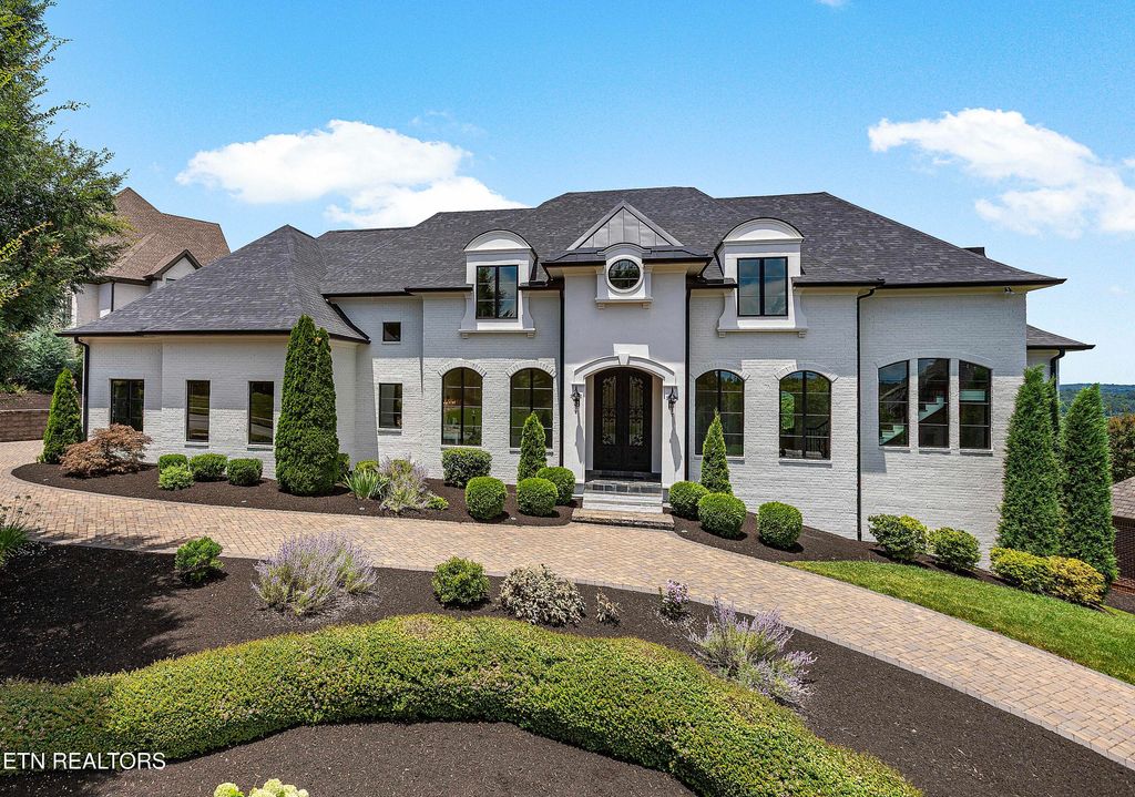 Located in Bridgemore, this elegant home rests above a lush scenic view of East Tennessee and dazzles from the brick paved drive and manicured landscaping to the lovely architectural design and touches located within. Through the arched front doors and into the vaulted foyer, a lovely paint palette and beautiful hardwood floors create a canvas waiting for your personal design. The primary living space is open and grand with a circular tray ceiling, beautiful marble fireplace, custom mantle, and plenty of space to host family and friends while enjoying your view. A covered balcony with space for seating or dining al fresco is ideal for additional living space and entertaining with curved arches framing your view perfectly. Seamlessly attached to the living space is a large eat-in kitchen with a keeping room that will be your favorite spot to spend time home alone. The kitchen has so much to offer with its large island/breakfast bar, sharp white cabinetry, gas cooktop, paneled refrigerator, glass front cabinetry, ample marble countertop space, plus a large walk-in pantry with lots of room for storing foodstuffs and small appliances. A grand primary suite with a tray ceiling and a built-in wardrobe awaits to provide the rejuvenation you need. The attached bath has a walk-in shower with seat, an elegant tile floor, dual sinks, linen storage, soaking tub plus a walk-in closet with custom racks, shelves and dressers. A guest bath, additional storage and a home office with custom built-in storage and shelving and an incredible view complete the main level of this home. The upper level has two spacious en-suite bedrooms and tons of storage for all your seasonal items. The lower level has so much additional space for living and entertaining with room for seating, media, and gaming tables. A workout room, additional storage and the remaining spacious ensuite bedroom completes this lower level. The exterior has covered space for entertaining outdoors and a large lush lawn with landscaped edges offers beauty in its simplicity while still offering potential to create the backyard perfect for you and your household.