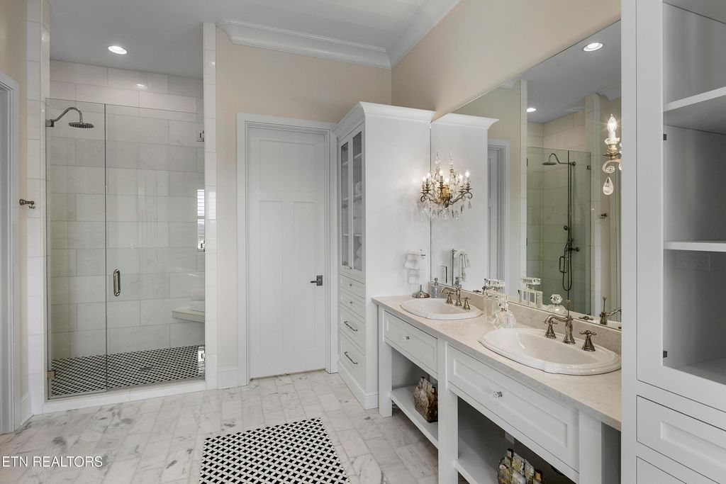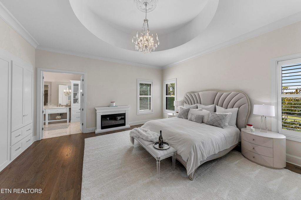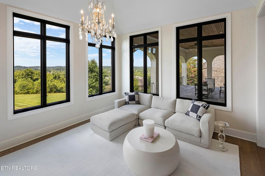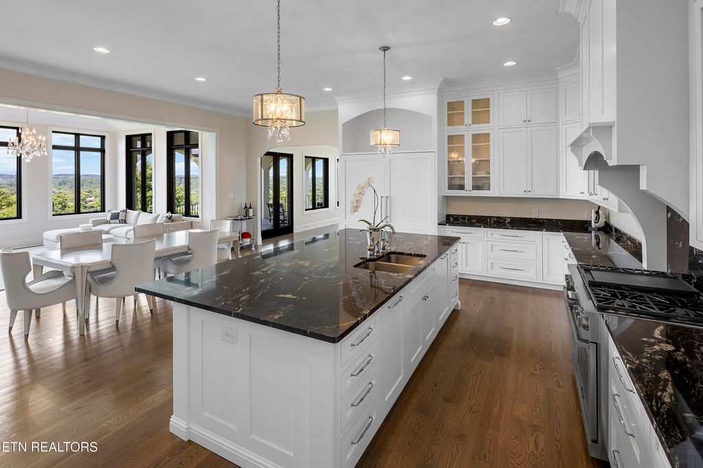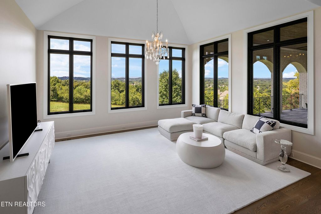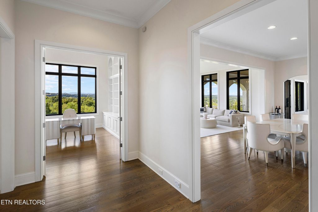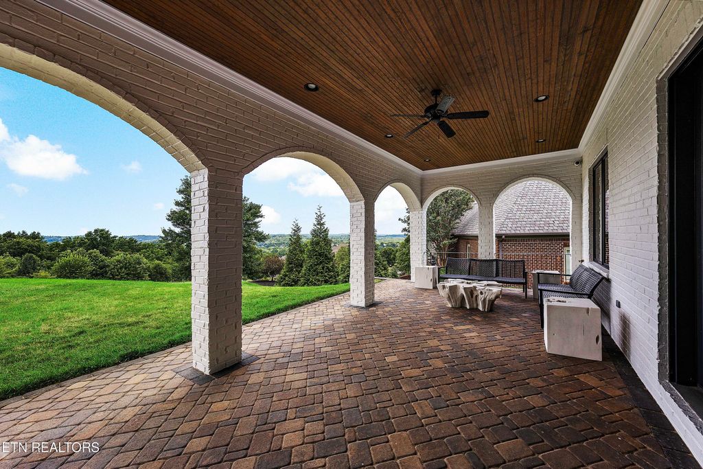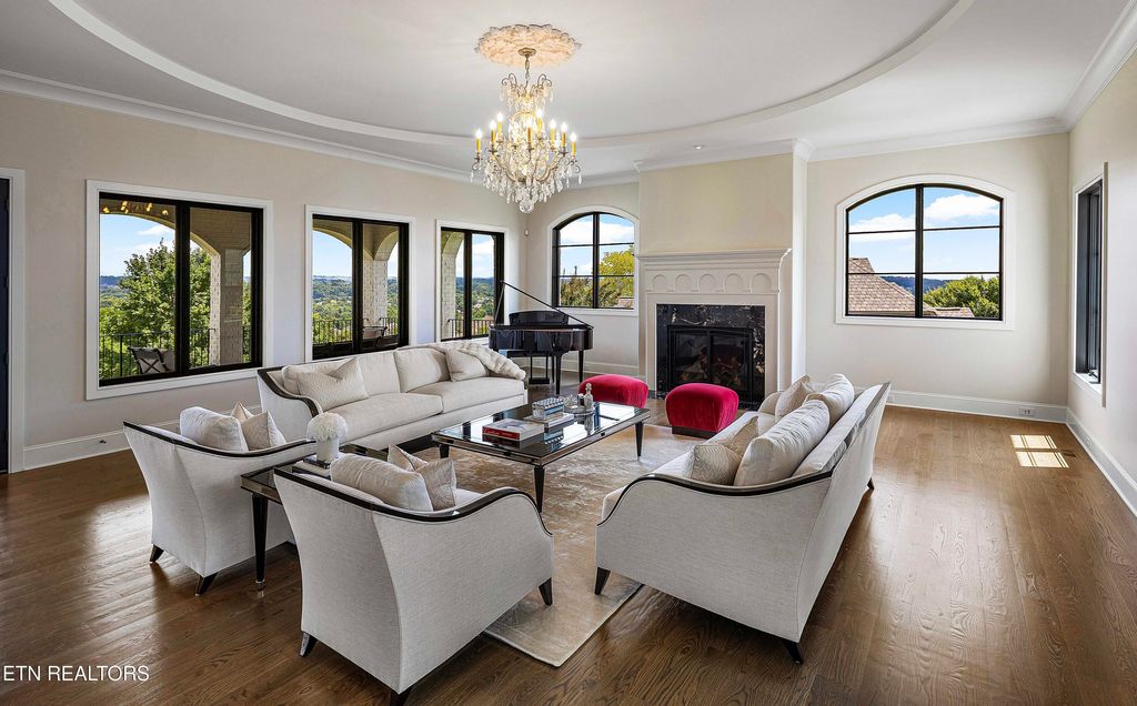 Located in Bridgemore, this elegant home rests above a lush scenic view of East Tennessee and dazzles from the brick paved drive and manicured landscaping to the lovely architectural design and touches located within. Through the arched front doors and into the vaulted foyer, a lovely paint palette and beautiful hardwood floors create a canvas waiting for your personal design. The primary living space is open and grand with a circular tray ceiling, beautiful marble fireplace, custom mantle, and plenty of space to host family and friends while enjoying your view. A covered balcony with space for seating or dining al fresco is ideal for additional living space and entertaining with curved arches framing your view perfectly. Seamlessly attached to the living space is a large eat-in kitchen with a keeping room that will be your favorite spot to spend time home alone. The kitchen has so much to offer with its large island/breakfast bar, sharp white cabinetry, gas cooktop, paneled refrigerator, glass front cabinetry, ample marble countertop space, plus a large walk-in pantry with lots of room for storing foodstuffs and small appliances. A grand primary suite with a tray ceiling and a built-in wardrobe awaits to provide the rejuvenation you need. The attached bath has a walk-in shower with seat, an elegant tile floor, dual sinks, linen storage, soaking tub plus a walk-in closet with custom racks, shelves and dressers. A guest bath, additional storage and a home office with custom built-in storage and shelving and an incredible view complete the main level of this home. The upper level has two spacious en-suite bedrooms and tons of storage for all your seasonal items. The lower level has so much additional space for living and entertaining with room for seating, media, and gaming tables. A workout room, additional storage and the remaining spacious ensuite bedroom completes this lower level. The exterior has covered space for entertaining outdoors and a large lush lawn with landscaped edges offers beauty in its simplicity while still offering potential to create the backyard perfect for you and your household.