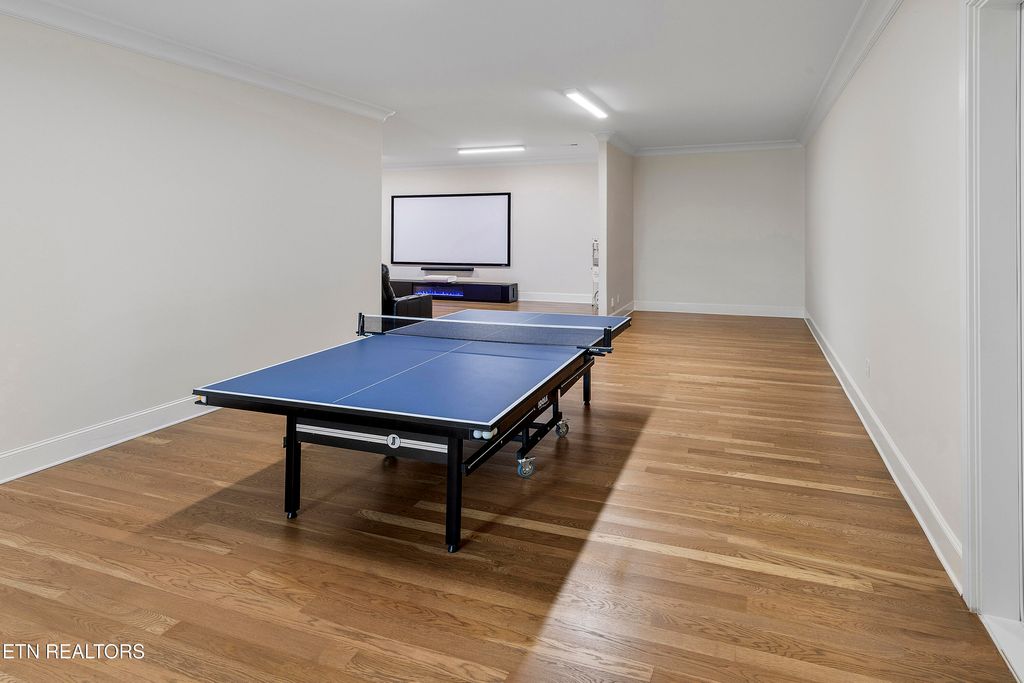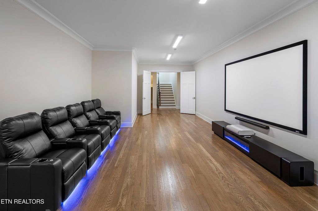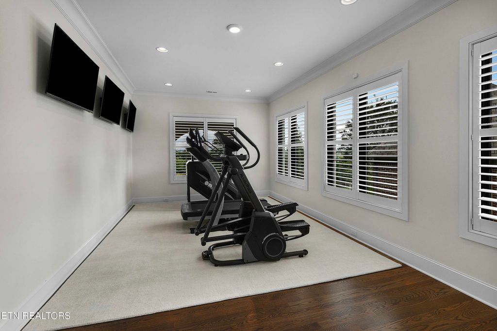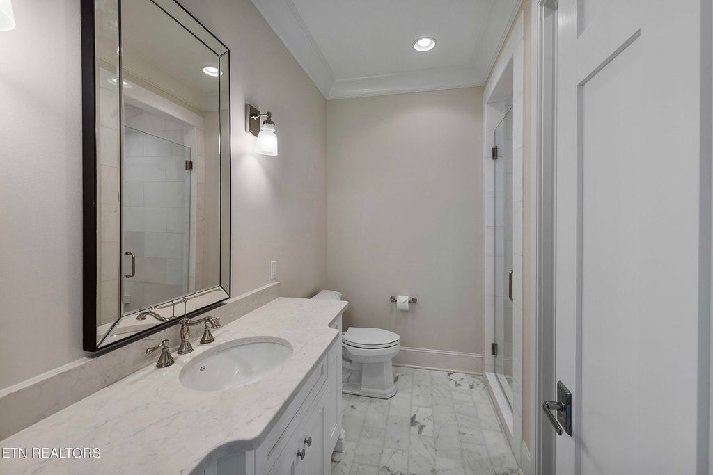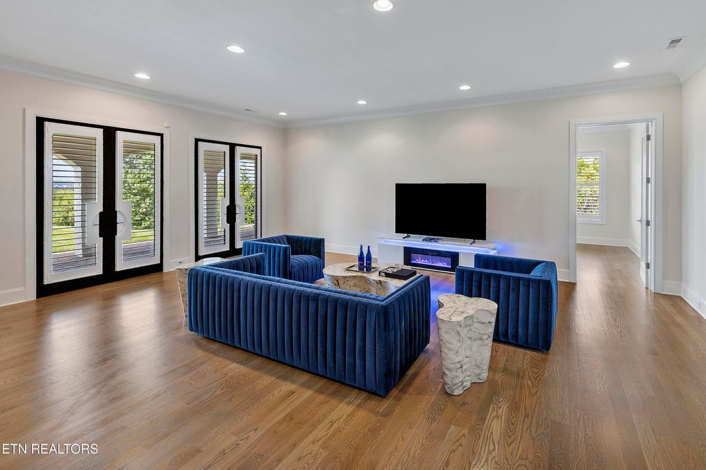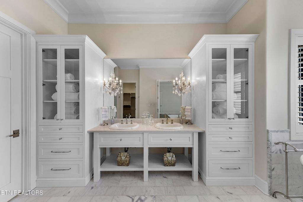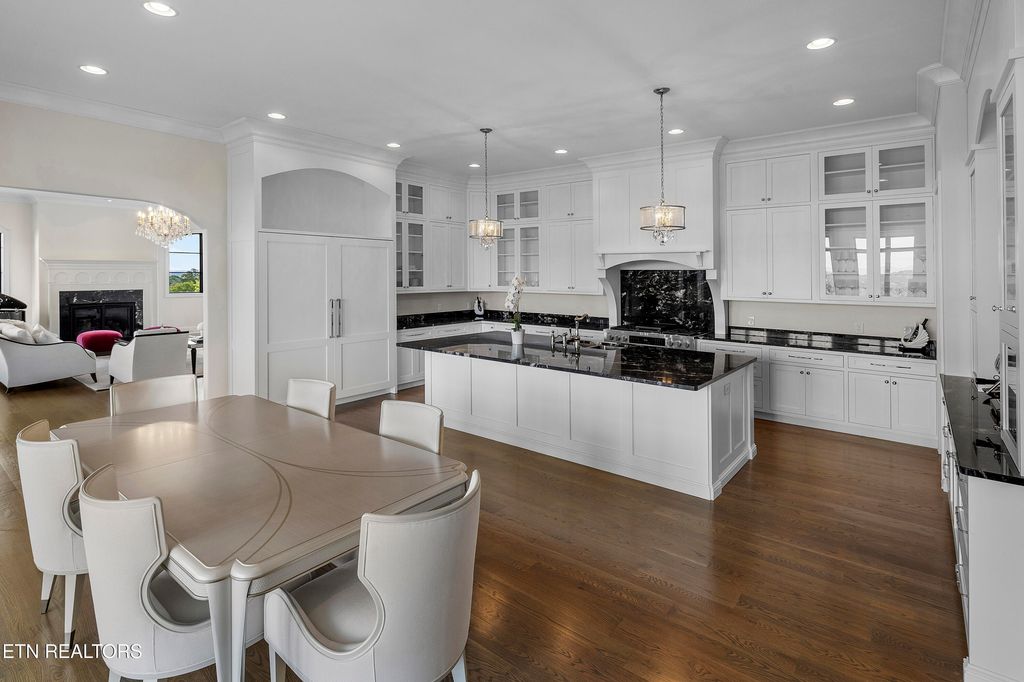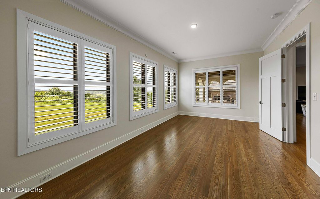Located in Bridgemore, this elegant home rests above a lush scenic view of East Tennessee and dazzles from the brick paved drive and manicured landscaping to the lovely architectural design and touches located within. Through the arched front doors and into the vaulted foyer, a lovely paint palette and beautiful hardwood floors create a canvas waiting for your personal design. The primary living space is open and grand with a circular tray ceiling, beautiful marble fireplace, custom mantle, and plenty of space to host family and friends while enjoying your view. A covered balcony with space for seating or dining al fresco is ideal for additional living space and entertaining with curved arches framing your view perfectly. Seamlessly attached to the living space is a large eat-in kitchen with a keeping room that will be your favorite spot to spend time home alone. The kitchen has so much to offer with its large island/breakfast bar, sharp white cabinetry, gas cooktop, paneled refrigerator, glass front cabinetry, ample marble countertop space, plus a large walk-in pantry with lots of room for storing foodstuffs and small appliances. A grand primary suite with a tray ceiling and a built-in wardrobe awaits to provide the rejuvenation you need. The attached bath has a walk-in shower with seat, an elegant tile floor, dual sinks, linen storage, soaking tub plus a walk-in closet with custom racks, shelves and dressers. A guest bath, additional storage and a home office with custom built-in storage and shelving and an incredible view complete the main level of this home. The upper level has two spacious en-suite bedrooms and tons of storage for all your seasonal items. The lower level has so much additional space for living and entertaining with room for seating, media, and gaming tables. A workout room, additional storage and the remaining spacious ensuite bedroom completes this lower level. The exterior has covered space for entertaining outdoors and a large lush lawn with landscaped edges offers beauty in its simplicity while still offering potential to create the backyard perfect for you and your household.