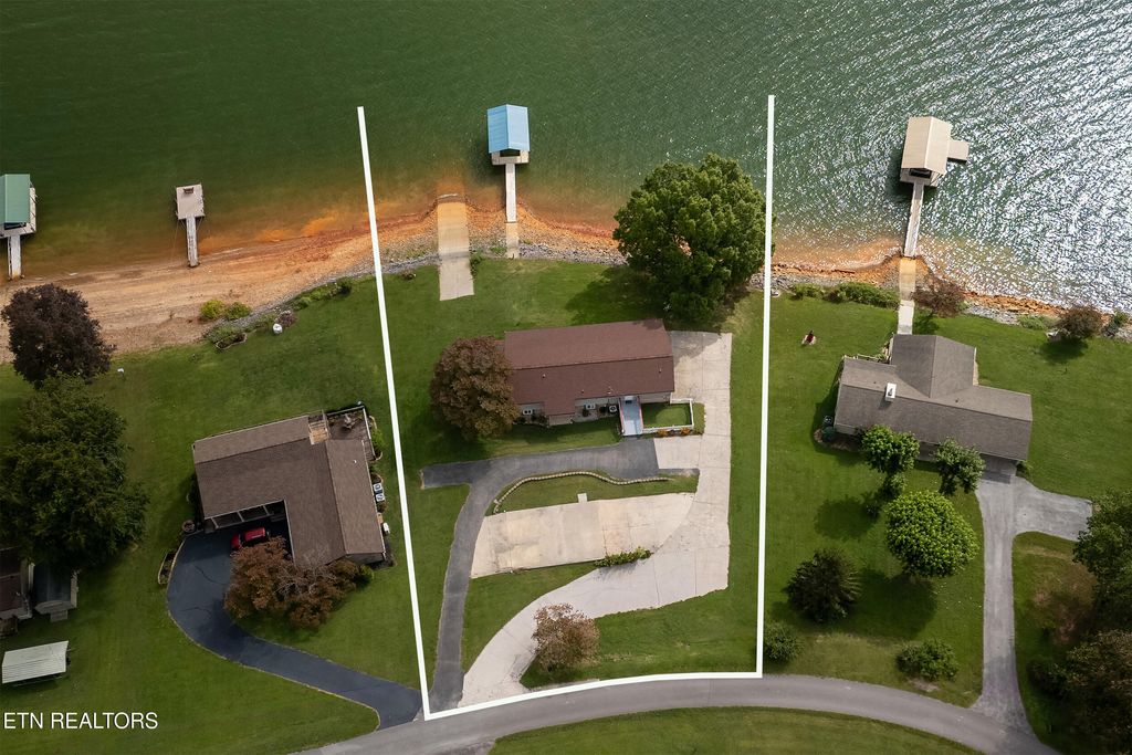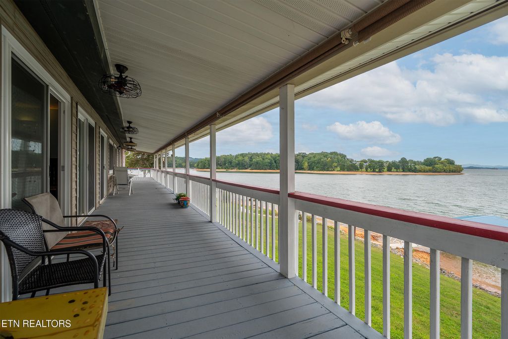 Have you been dreaming of living on the lake with your own private dock? This home boasts an absolutely breath-taking view of Cherokee lake and the Mountains to the East it is a must see! Come fall in love with this lakefront property with tons of windows and extensive 64' covered porch to take in the stunning and tranquil beauty. Gentle slope to the water with new 2024 covered dock, gangway and concrete boat launch with electric winch. This well-built home with Master BR with ensuite bath addition in 2006 to expand the main level square footage to 1427, total of 2854 on both levels, is a perfect retreat. You'll find full 3 bedrooms and 2 ½ baths on the main level and additional bonus rooms on the finished lower level with room for game/TV room and a full bath. Roof was proactively replaced in 2022. Driveway has 3 levels with circular access and plenty of room to store your boat off season and wraps around to the 2 car garage with workshop. Beautiful landscaping throughout on the just under ½ acre yard, small fenced area your pet in the front and concrete pad on lower level covered patio to rear of property. Huge 2 story storage shed - lower-level access for mower/garden supplies and upper level opens onto the main level rear deck with ample storage for patio furniture and water toys. HVAC 2012, washer 2024, stove and dishwasher 2014. Beautiful Cherokee Lake is known for wonderful bass fishing, clear blue water, and the amazing setting in the Tennessee hillsides. You will find over 28,000 surface acres surrounded by 400 miles of shoreline and this home has one of the best views you could hope for. Million dollar view, without the million dollar price tag! Call for your showing today and make this gem your own lake front living destination.