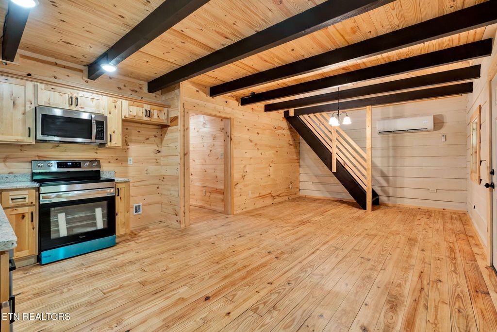 Inside, you'll love the warm wood finishes, exposed beams, and open floor plan. The kitchen is outfitted with stainless steel appliances, granite countertops, and custom wood cabinetry. Natural light fills the space, highlighting the craftsmanship throughout.