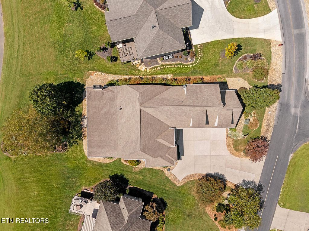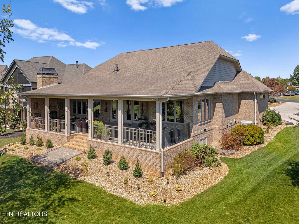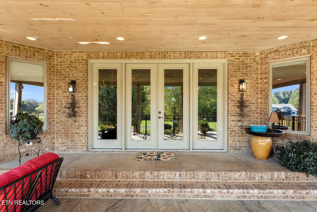 Step outside onto the expansive covered back deck and be mesmerized by the spectacular views of the Smoky Mountains and the 17th fairway and green. This space is perfect for entertaining, featuring a stained concrete floor, a tongue and groove ceiling with can lighting and ceiling fans, and a brick wood-burning fireplace with a gas starter. An aluminum railing with a gate and wide brick steps lead down to a lower paver patio area, expanding your outdoor living options.