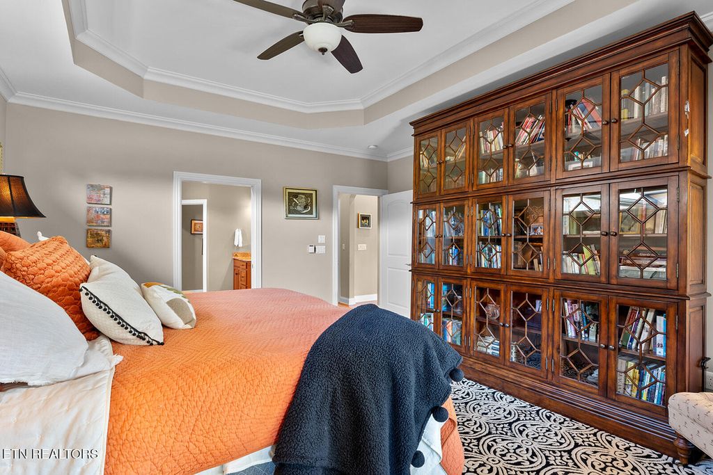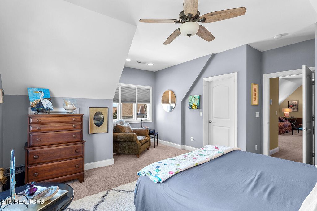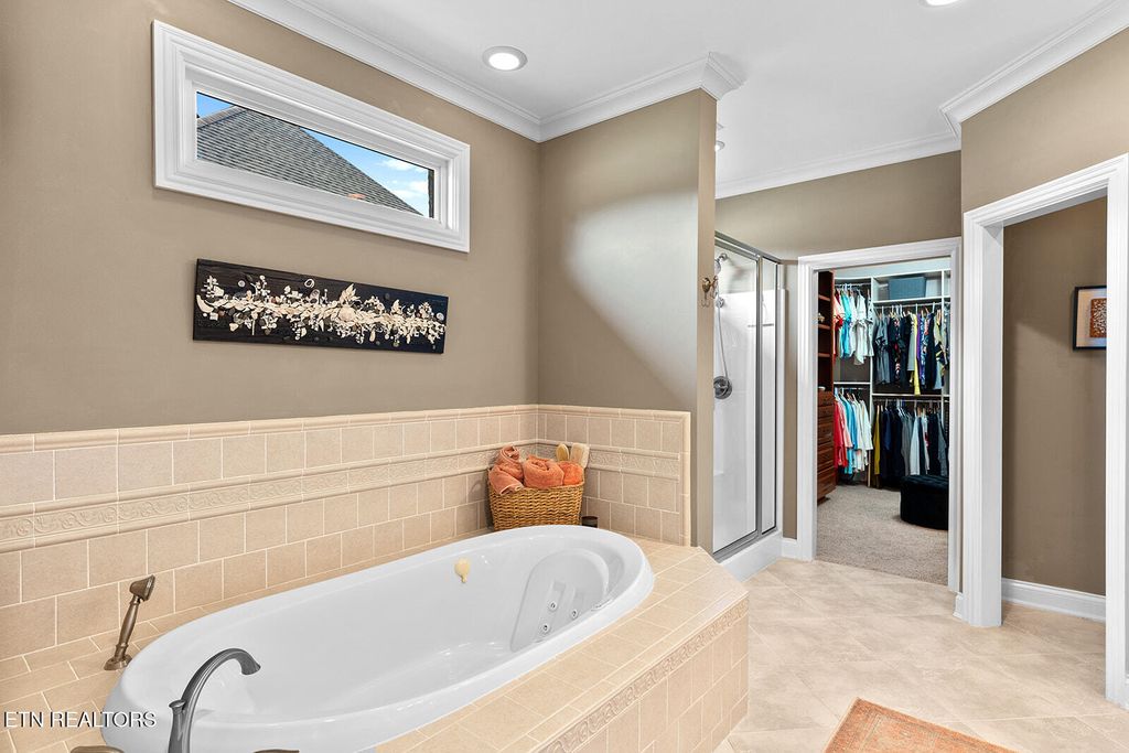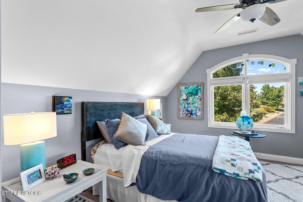 The primary suite is a personal retreat, offering a spacious bedroom with a lighted ceiling fan, a transom window, and large windows that frame stunning views. The en suite bathroom is luxurious, with his-and-hers pecan cabinetry, granite countertops, a jetted tub, and a large walk-in shower. A generously sized walk-in closet with additional access to the laundry room completes this serene space.