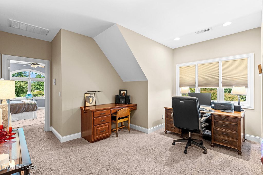 On the second level, you'll find a guest suite area with carpeted flooring and can lighting. A bonus room, perfect for a desk or sitting area, and two additional guest bedrooms provide comfortable accommodations, while a second full bathroom ensures convenience for all.