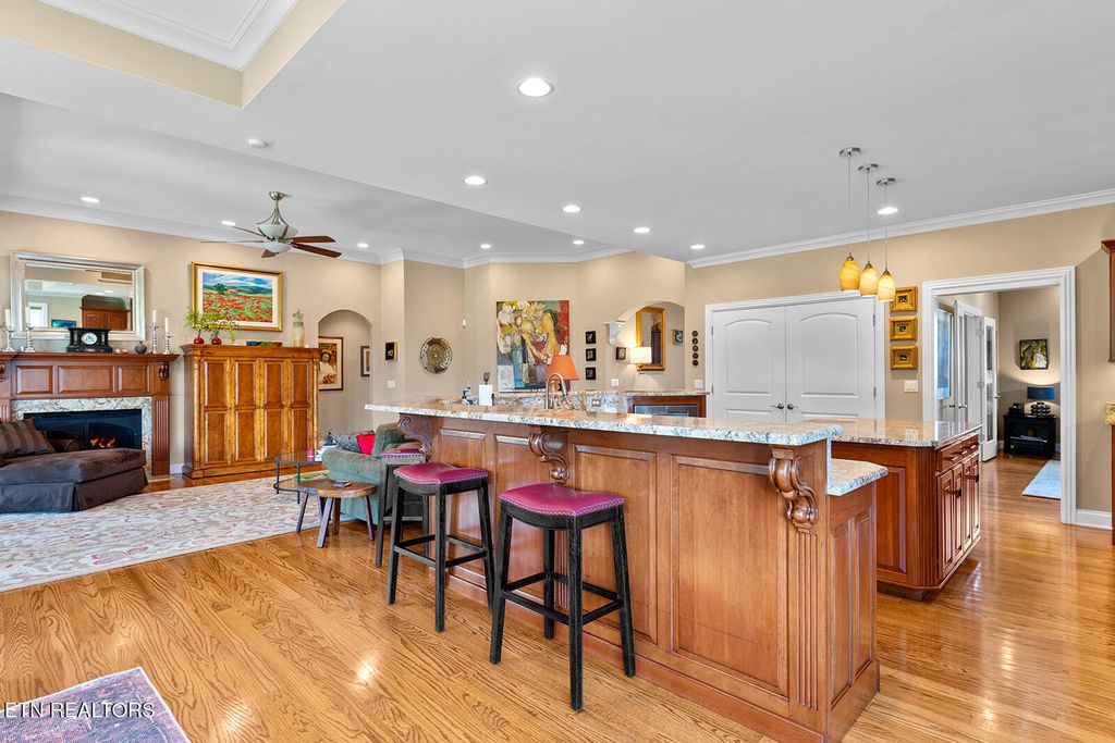 The heart of the home lies in the open kitchen, breakfast area, and great room, all offering exquisite views of the golf course and mountains. The kitchen features custom pecan cabinetry, a granite countertop island with wine racks, under-cabinet lighting, and top-of-the-line stainless appliances, including a new KitchenAid oven with convection and a Bosch dishwasher. The adjacent breakfast area and great room provide a cozy yet open atmosphere, complete with a gas log fireplace and a hidden niche that currently serves as a bar areaâ€'a delightful surprise!