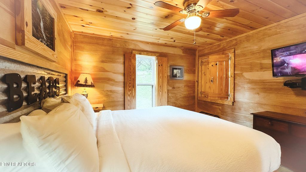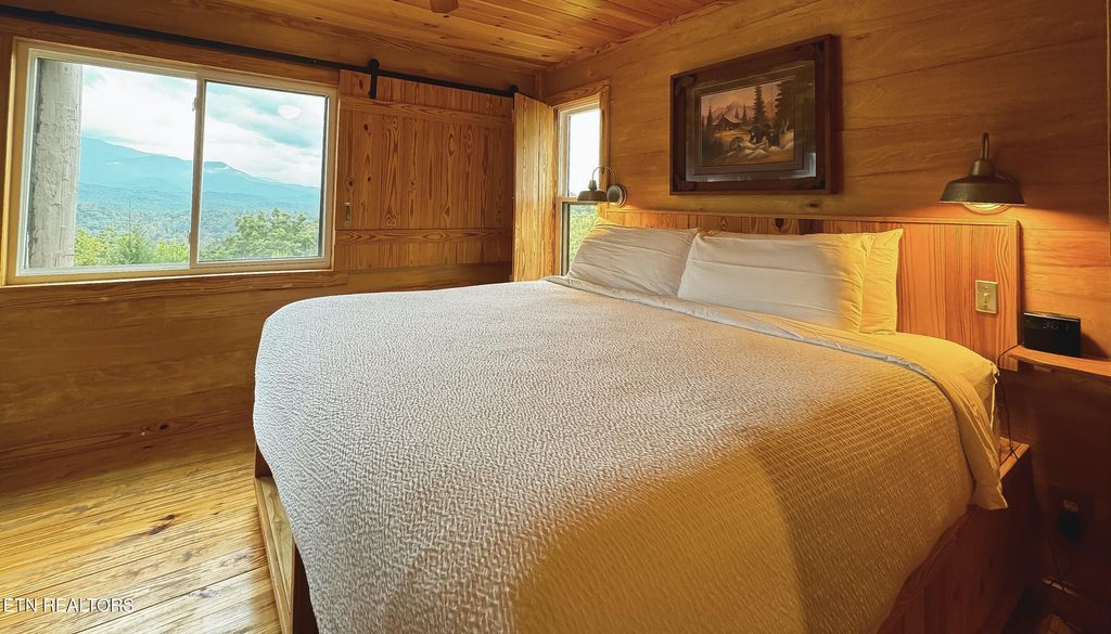 Best Views of the Smokies seen right from your private balcony of this gorgeous recently remodeled turn-key 2 Bedroom/ 2 Full Bathroom condo at Deer Ridge Mountain Resort in Gatlinburg. The condo features tongue & groove ceilings and natural wood walls that bring a great rustic design element creating a cabin like experience full of warmth and charm. The updated kitchen has stainless steel appliances, customized wood cabinets with decorative door pulls, recessed can lighting along with stylized mason jar pendant lights over the bar. Get cozy in the living room by the wood burning fireplace or relax out on your very own private balcony overlooking the breathtaking mountain views. The back bedroom showcases a large window with sliding barn door cover that brings in natural sunlight and highlights the serene mountain views all from your large comfortable bed. You can also access the balcony from the bedroom, which is a special design feature offered in an only a few select floor plans at Deer Ridge. The other bedroom, located in the front of the condo, is ''BEAR'' themed with beautiful wood paneling, tongue and groove wood ceiling and wood framed window panels making this room fun and cozy. Both Bathrooms are updated with wood paneling, corrugated ceiling and tiled flooring along with accents of pine cones and bears. The Deer Ridge Mountain Resort subdivision offers a heated indoor pool, jacuzzi hot tub, steam room, picnic and grilling areas, tennis courts, clubhouse, playground with basketball court, onsite coin laundry, and outdoor patio area for relaxing and enjoying the mountain views. This amazing property is also conveniently located to Dollywood, Pigeon Forge, Sevierville, Downtown Gatlinburg, and the Great Smoky Mountain National Park. Currently on an overnight rental program. Drone photography has been used for some photos.