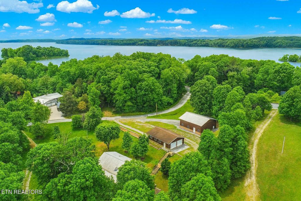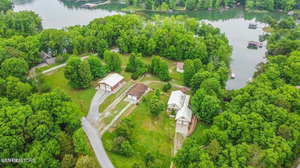 Lakefront Log Cabin on 1.6 Acres with Private Dock, Private Boat Ramp & Multiple Garages situated on a dead-end road with a corner lot.