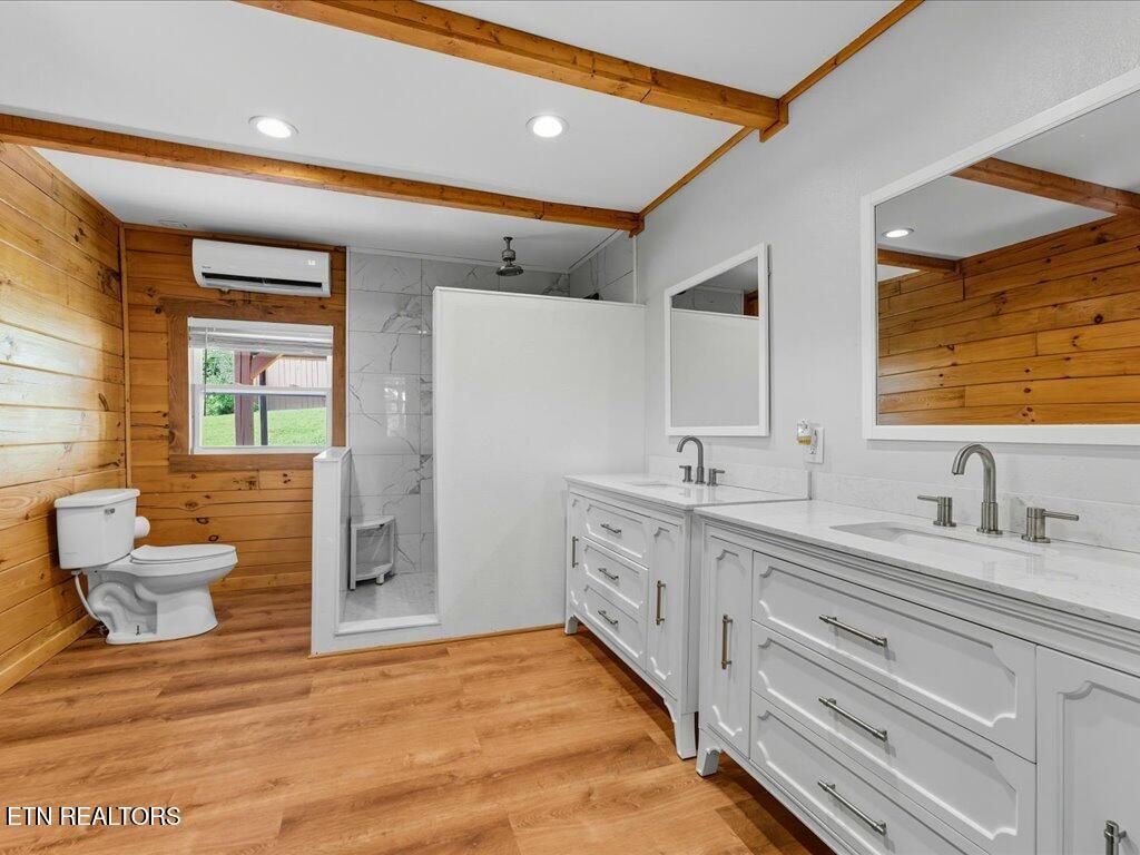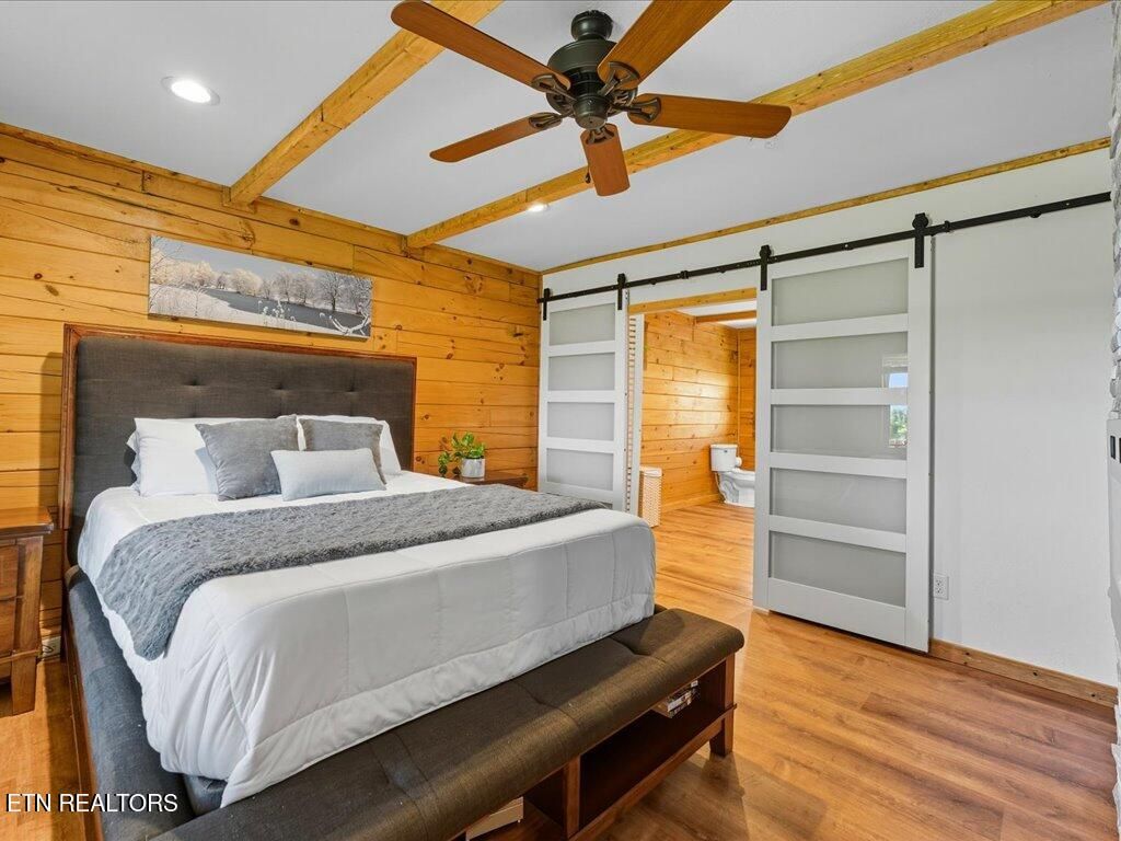 The open-concept layout feels spacious and inviting, with a true split-bedroom design that gives everyone their own corner of the house. The kitchen and living areas flow together, highlighted by beamed ceilings, barn doors, and the warmth of electric fireplaces. In the primary suite, you'll find a large walk-in shower with two shower heads, double vanities, and plenty of elbow room.