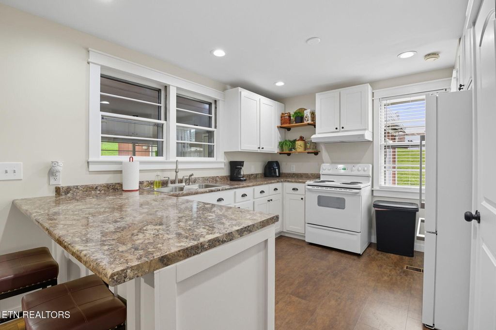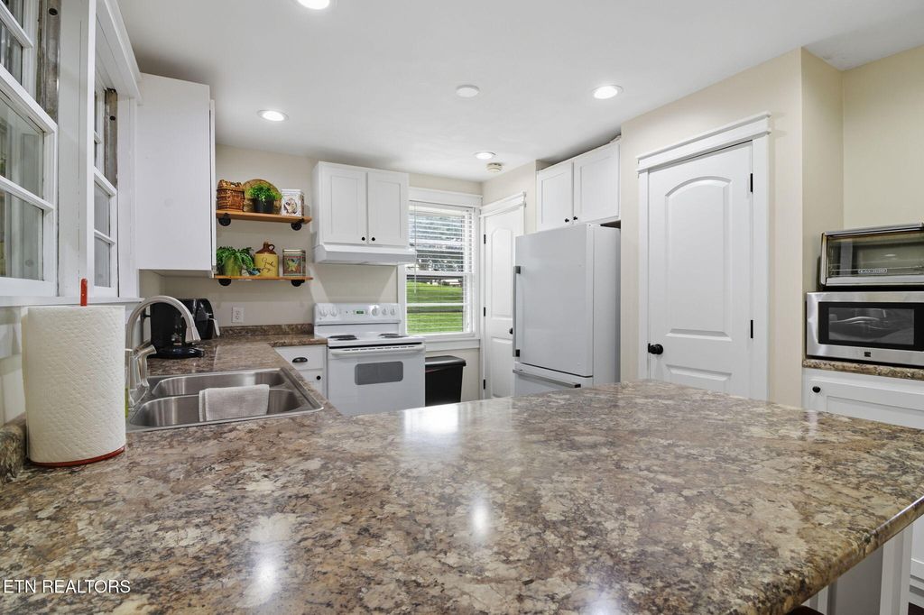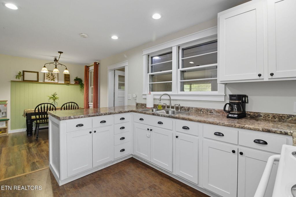 Inside, you'll find a bright, modern kitchen with crisp white cabinetry, open shelving, stylish countertops, and recessed lighting. The dining area features a custom accent wall and designer light fixture, creating a warm and inviting space for meals and conversation.