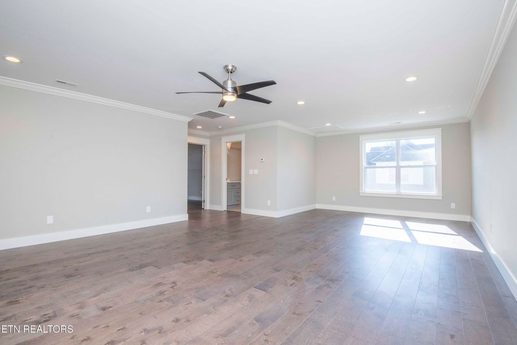 Hardwood floors, crown molding, and 9-ft ceilings throughout the main level.