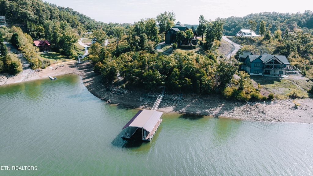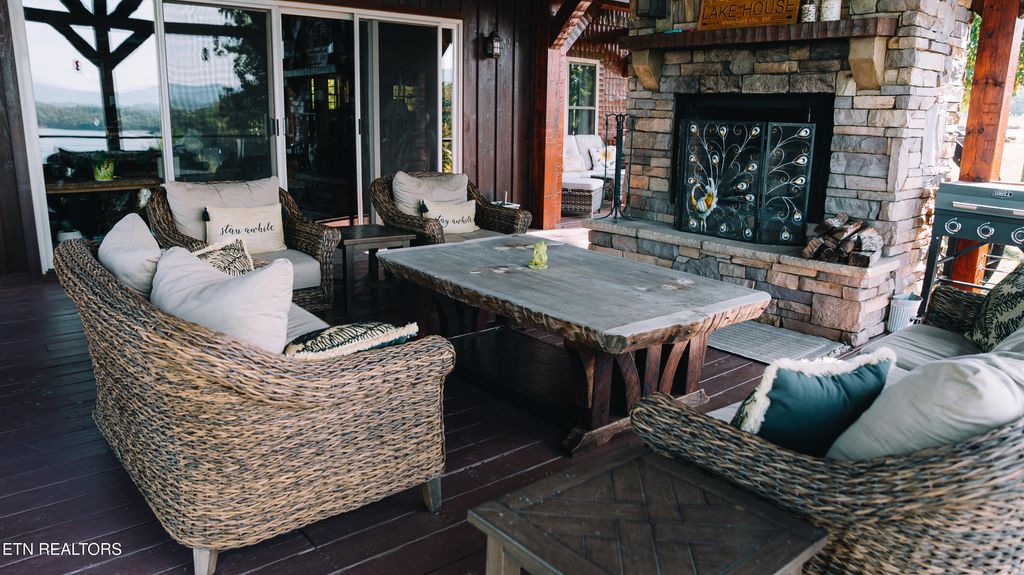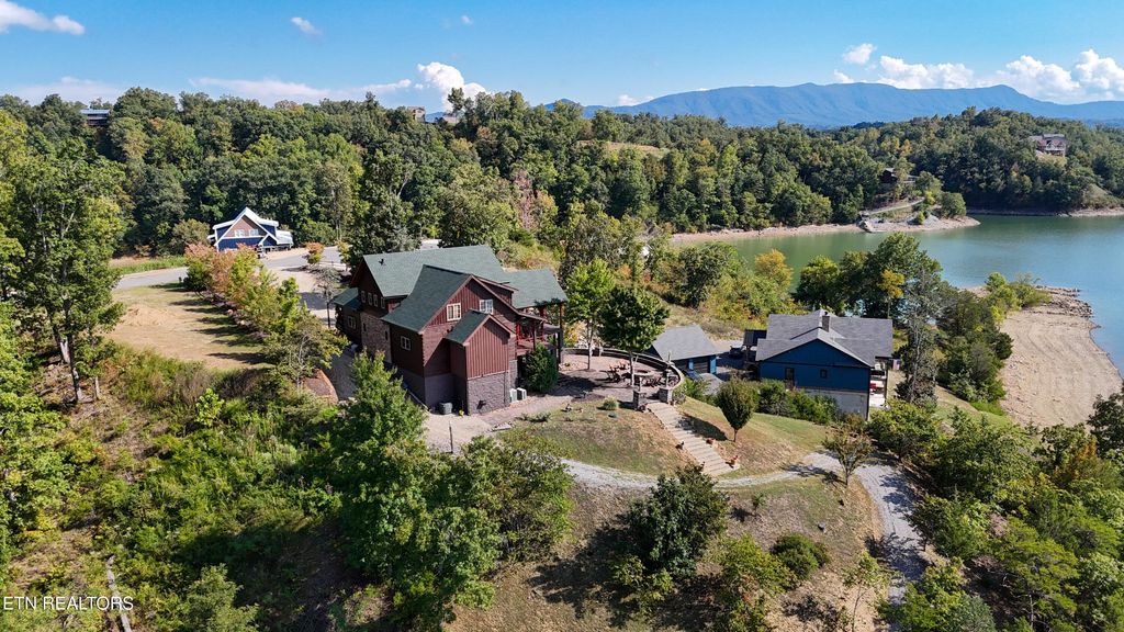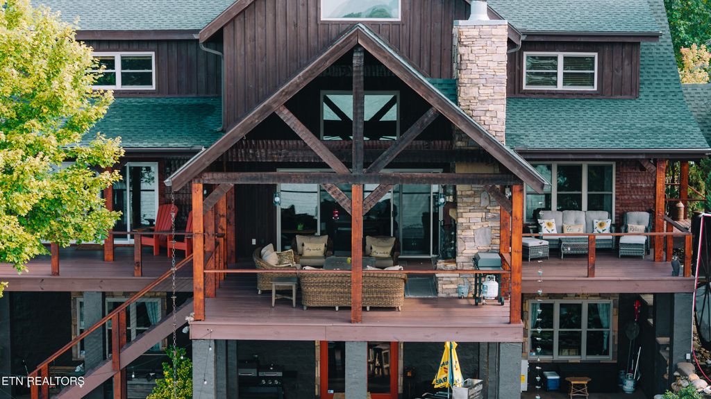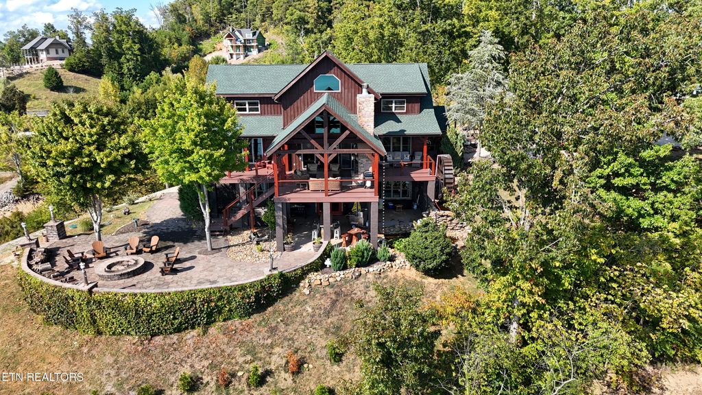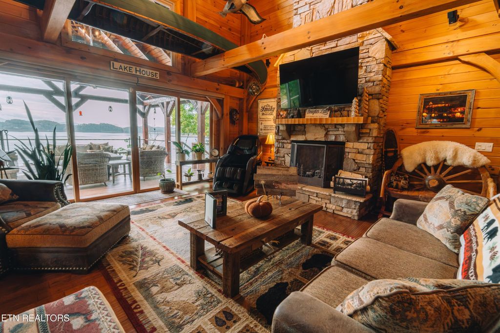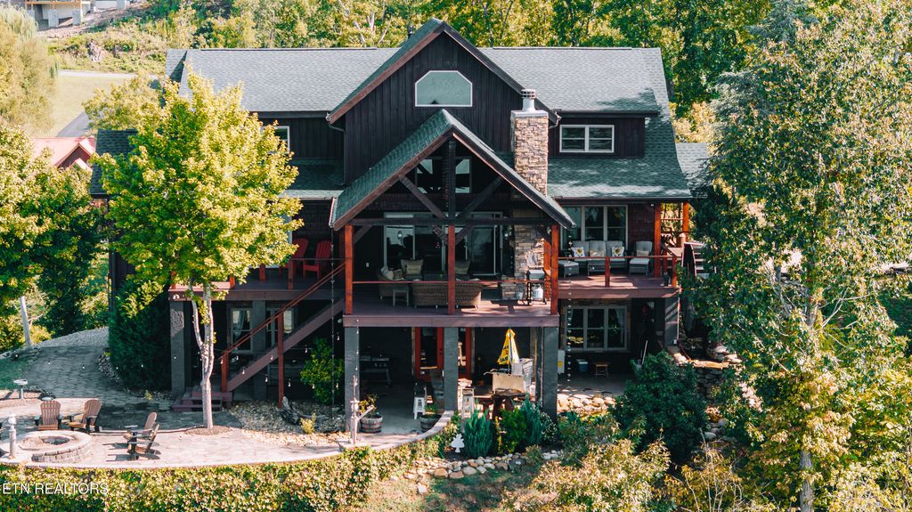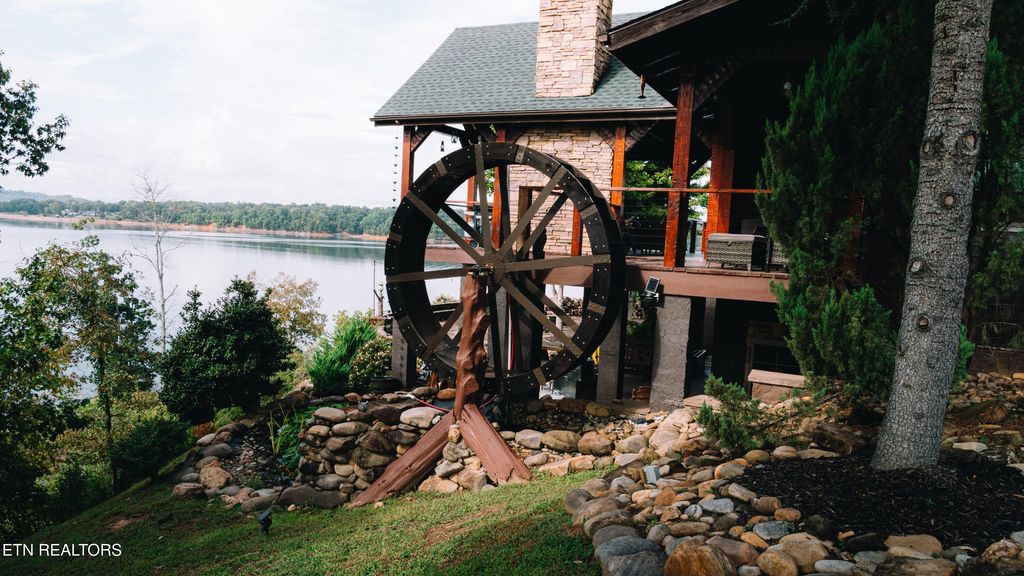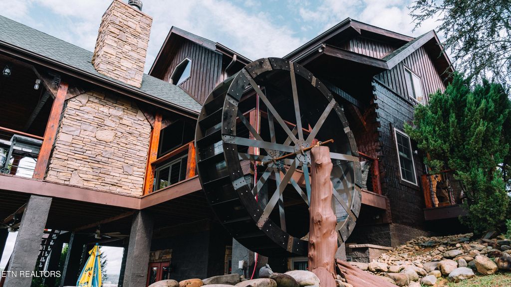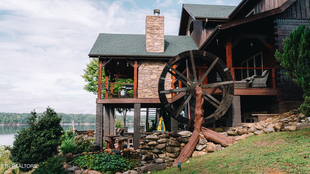 Luxury Timber Frame Log Cabin with Unbelievable Entertainment Basement! Nestled on the serene shores of Douglas Lake in Dandridge, Tennessee, this exquisite 3-bedroom, 5-bathroom timber frame log cabin offers unparalleled luxury and breathtaking views of the Great Smoky Mountains. Designed for those who crave sophistication, tranquility, and world-class entertaining, this dockable waterfront retreat is a masterpiece of craftsmanship and modern amenities. Step inside to a warm, open-concept interior with soaring ceilings, hand-hewn timbers, and expansive windows showcasing stunning main channel lake views. The gourmet kitchen, equipped with high-end appliances and custom cabinetry, flows seamlessly into the spacious living area, perfect for cozy evenings by the stone fireplace. Each of the three generously sized bedrooms features en-suite bathrooms, ensuring privacy and comfort for family or guests. The lower level is an entertainer's paradise, boasting an unbelievable custom basement designed for unforgettable gatherings. At its heart is a massive, professionally crafted bar area, complete with ample seating, sleek countertops, and space for hosting lively parties and events. This extraordinary basement also includes a state-of-the-art movie theater, perfect for immersive movie nights or game-day watch parties, making it the ultimate hub for entertaining guests in style. Step outside to the expansive back porch and lower deck, where you can unwind while soaking in panoramic lake and mountain vistas. A charming waterwheel and serene pond enhance the meticulously landscaped grounds, offering beauty and privacy from neighbors. Additional features include an EV charger in the driveway for eco-conscious convenience, and an expansive boat dock for direct access to Douglas Lake for boating, fishing, or enjoying the water. This upscale retreat blends rustic charm with modern luxury, making it the perfect primary residence, vacation home, or investment property. The owners have made numerous improvements to this incredible home! Don't miss your chance to own this one-of-a-kind lakefront gem in the heart of Tennessee's natural beauty. Schedule your private tour today!