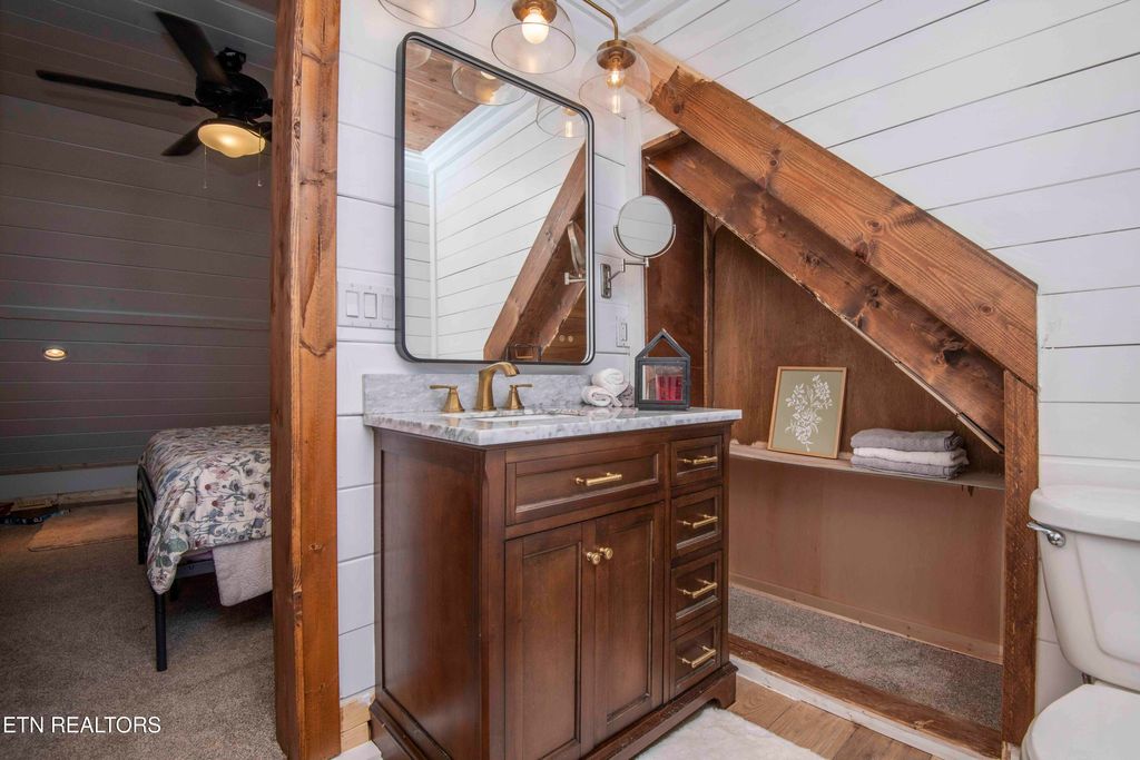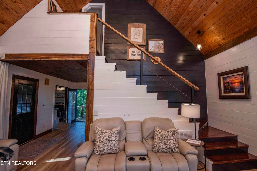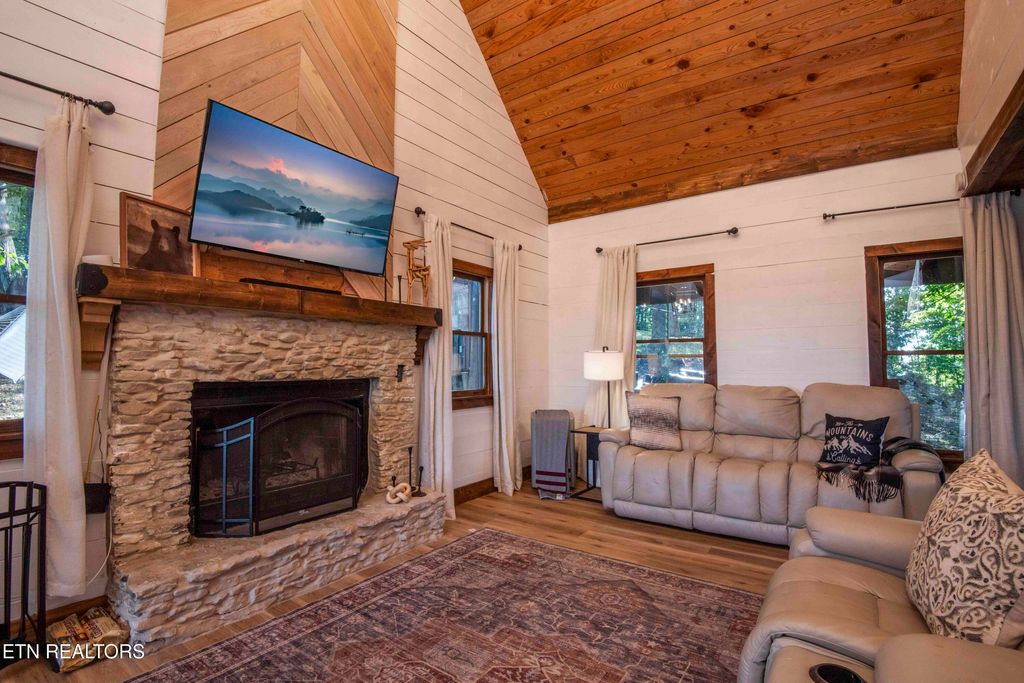 Nestled on 1.73 wooded acres and surrounded by stately white and red oaks, this recently renovated 2 bedroom, 2 bath cabin offers the perfect blend of rustic charm and modern convenience. Step inside to soaring cathedral ceilings, a cozy wood-burning fireplace, and a light-filled living area highlighted by a stunning grand chandelier.