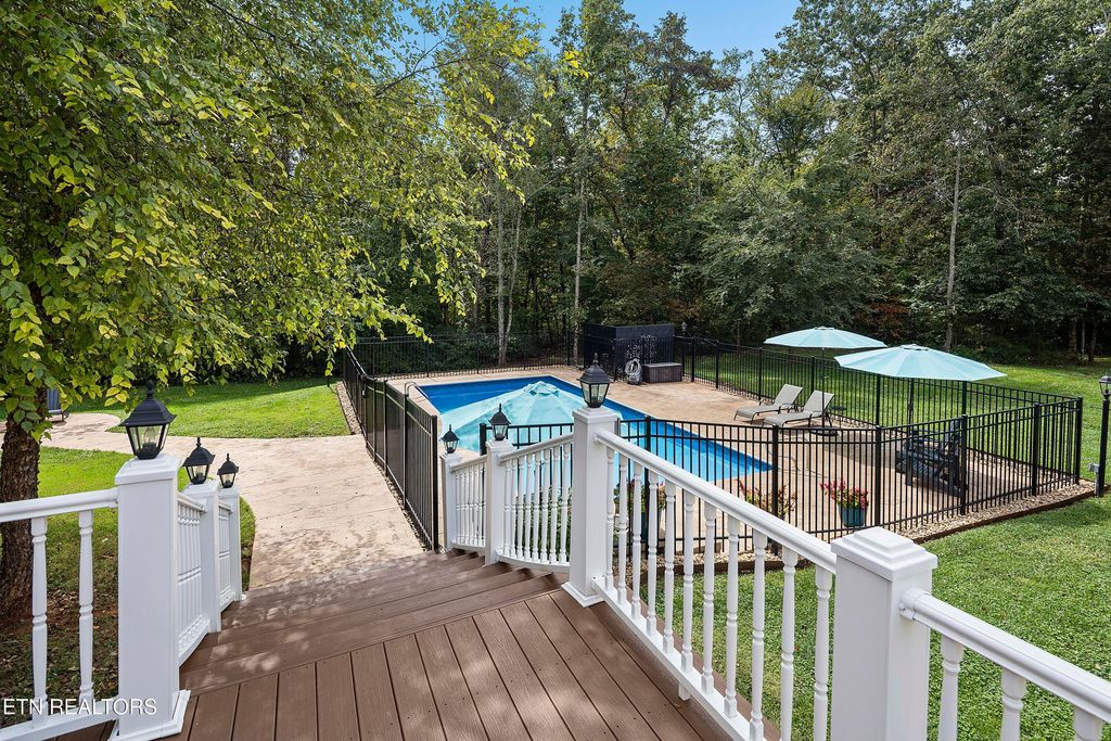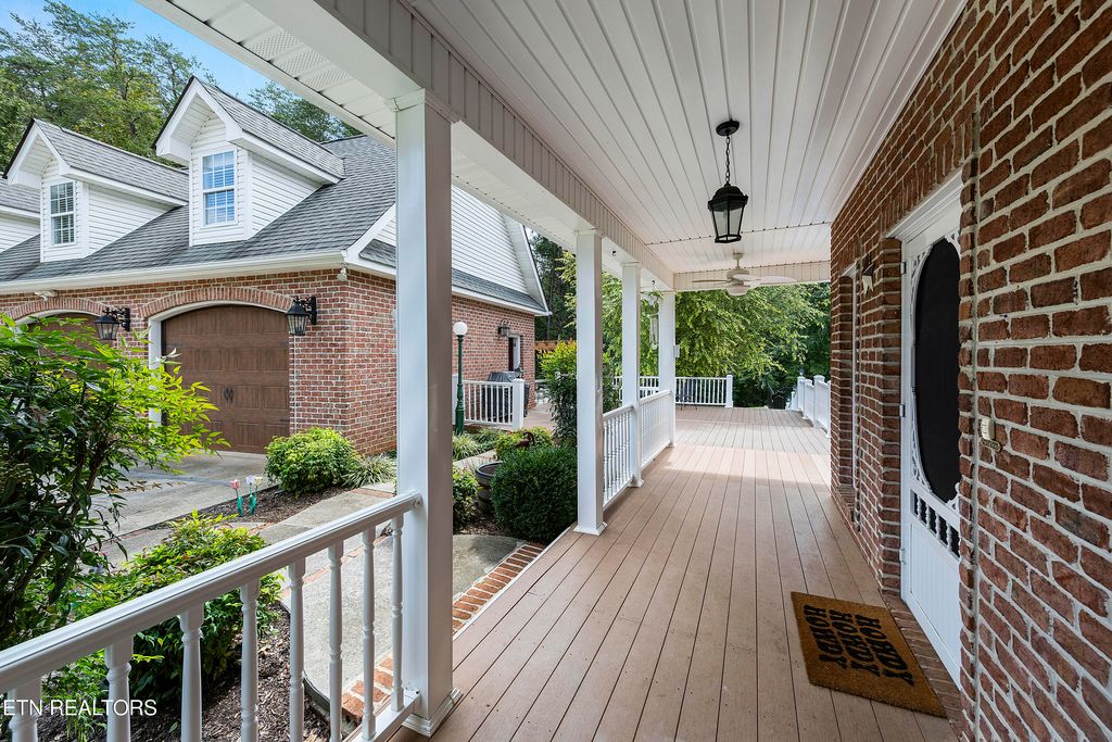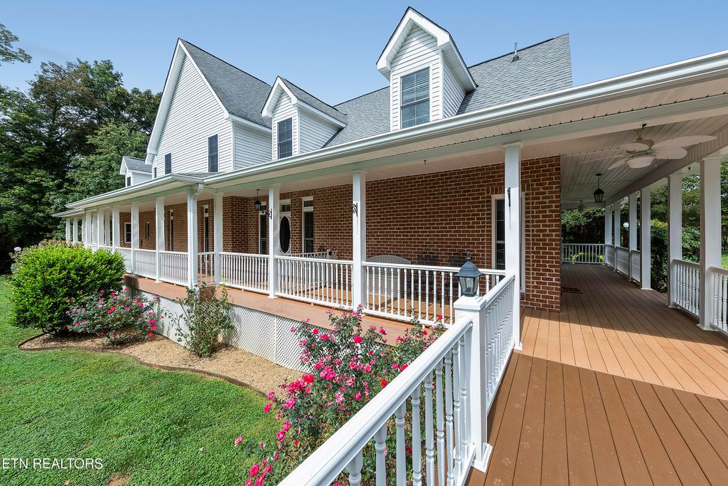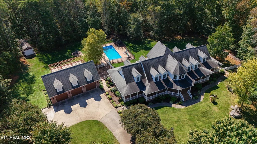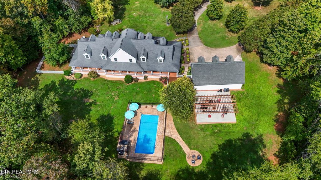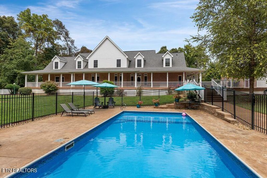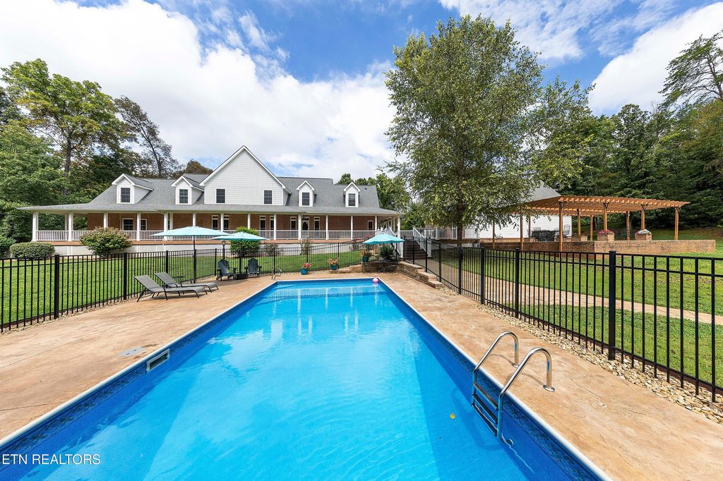 This sprawling estate located in a private, gated community rests on five rolling acres in a beautiful, park-like setting. Upon entering the property, the circular drive is gracefully landscaped and outlined with Crepe Myrtles. A true Southern Living type property with over 4,900 sq ft, 5 bedrooms, 4.5 baths and a wrap-around porch that surrounds the entire home. A desirable layout with both the primary and a private guest ensuite located on the first level, opening multiple options for living quarters. The spacious living room features a stacked stone fireplace, gleaming hardwood floors and French doors leading to the back porch. The chef's kitchen is the heart of the home and an entertainer's dream. Showcasing a grand oversized island, abundant custom cabinetry, upscale appliances and decorative wood beams, that create a welcoming gathering place for family and friends. The upper level includes three generous-sized bedrooms and a versatile bonus room, with the added benefit of a second laundry room. For the creative enthusiast, a custom-built craft room with its own exterior entrance provides the perfect space to work on your next masterpiece. Escape to the back-yard private oasis that awaits ultimate relaxation and entertaining. A pristine, heated, saltwater pool with sun shelf is a summer-time favorite. The recently updated, expansive, poured concrete patio with pergola is ideal for large gatherings. Enjoy a relaxing evening by the fire at the nearby fire-pit. The detached three-bay garage offers over 900 square feet of immaculate, climate-controlled space for vehicles and hobbies. Walk-up, floored attic space above provides limitless storage or space for a work-out station. An additional detached workshop/storage building offers generous space for equipment. The property features an invisible fence and a separate, fenced area off the side porch for pets. Experience the ultimate blend of peaceful serenity and vibrant convenience. Located within close proximity of Maryville, Lenoir City, and Knoxville, you'll have effortless access to shopping, dining, and entertainment. Outdoor enthusiasts will find the Great Smoky Mountains National Park and nearby lakes just a short drive away for hiking, biking, horseback riding, and water sports. This unique location offers the best of both worlds. A truly exceptional property!