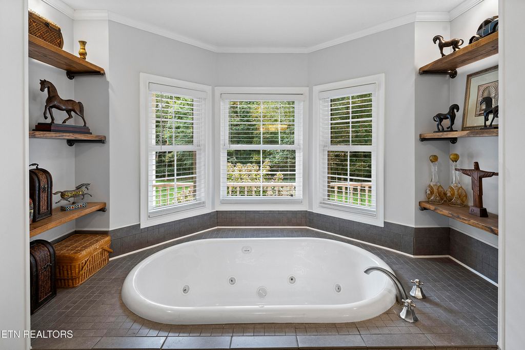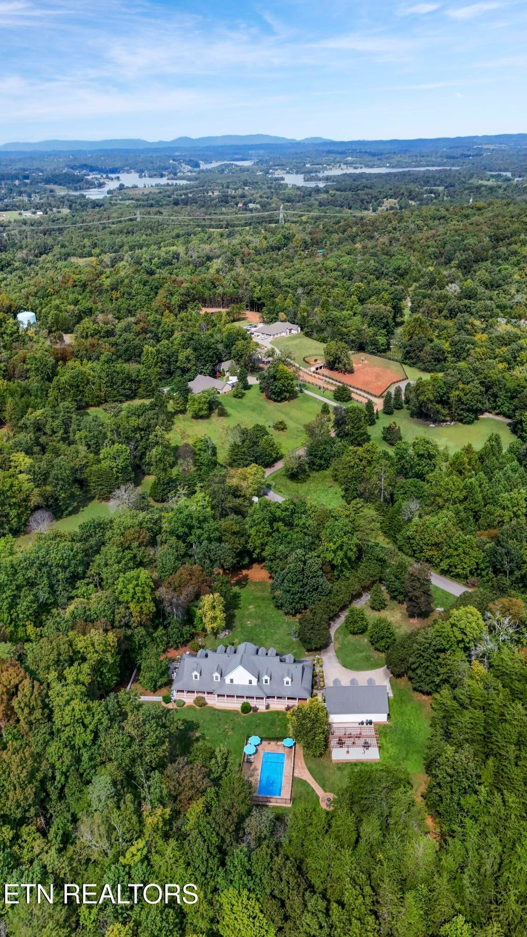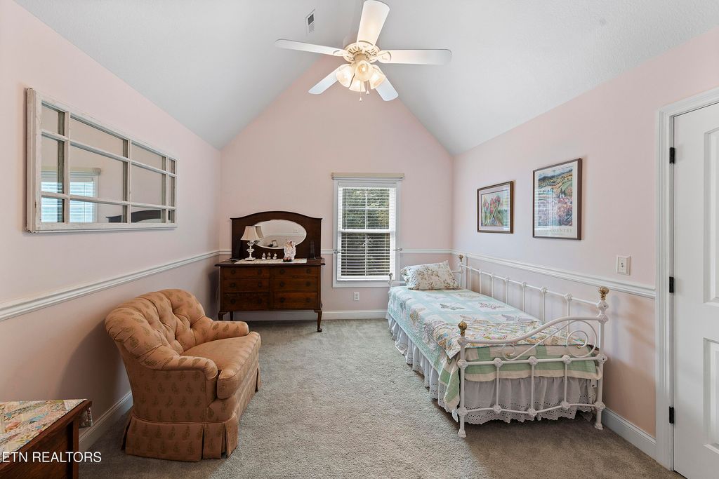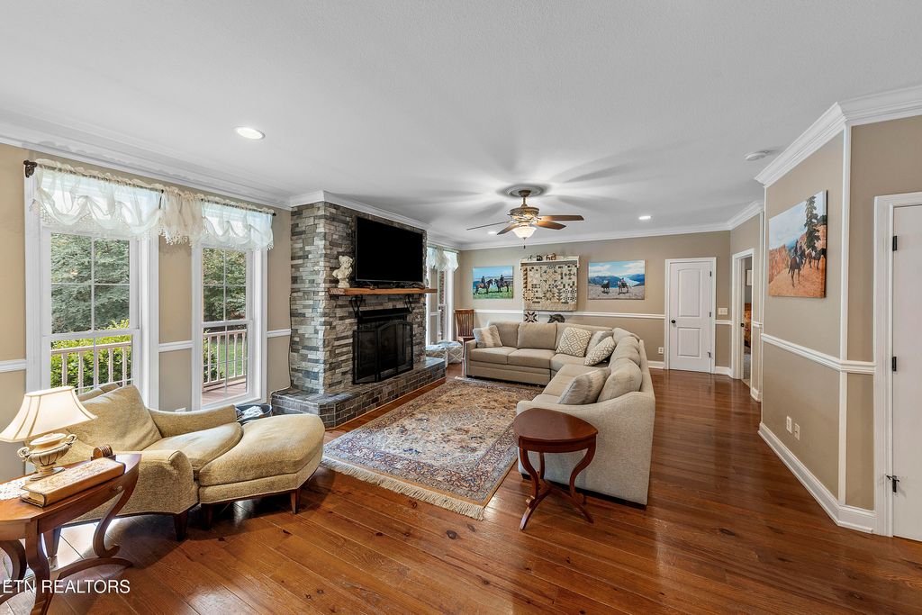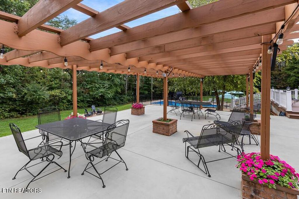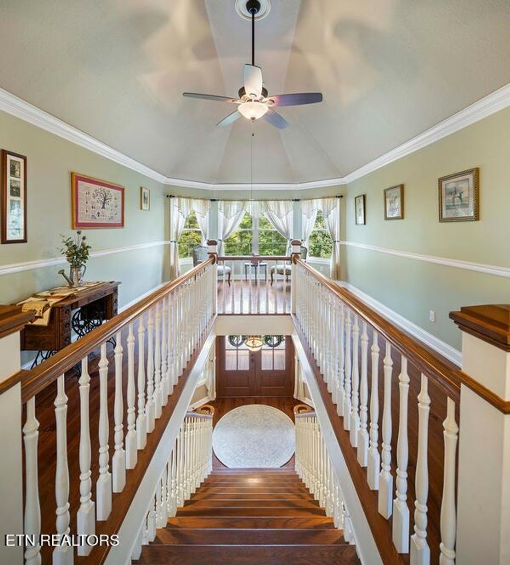 This sprawling estate located in a private, gated community rests on five rolling acres in a beautiful, park-like setting. Upon entering the property, the circular drive is gracefully landscaped and outlined with Crepe Myrtles. A true Southern Living type property with over 4,900 sq ft, 5 bedrooms, 4.5 baths and a wrap-around porch that surrounds the entire home. A desirable layout with both the primary and a private guest ensuite located on the first level, opening multiple options for living quarters. The spacious living room features a stacked stone fireplace, gleaming hardwood floors and French doors leading to the back porch. The chef's kitchen is the heart of the home and an entertainer's dream. Showcasing a grand oversized island, abundant custom cabinetry, upscale appliances and decorative wood beams, that create a welcoming gathering place for family and friends. The upper level includes three generous-sized bedrooms and a versatile bonus room, with the added benefit of a second laundry room. For the creative enthusiast, a custom-built craft room with its own exterior entrance provides the perfect space to work on your next masterpiece. Escape to the back-yard private oasis that awaits ultimate relaxation and entertaining. A pristine, heated, saltwater pool with sun shelf is a summer-time favorite. The recently updated, expansive, poured concrete patio with pergola is ideal for large gatherings. Enjoy a relaxing evening by the fire at the nearby fire-pit. The detached three-bay garage offers over 900 square feet of immaculate, climate-controlled space for vehicles and hobbies. Walk-up, floored attic space above provides limitless storage or space for a work-out station. An additional detached workshop/storage building offers generous space for equipment. The property features an invisible fence and a separate, fenced area off the side porch for pets. Experience the ultimate blend of peaceful serenity and vibrant convenience. Located within close proximity of Maryville, Lenoir City, and Knoxville, you'll have effortless access to shopping, dining, and entertainment. Outdoor enthusiasts will find the Great Smoky Mountains National Park and nearby lakes just a short drive away for hiking, biking, horseback riding, and water sports. This unique location offers the best of both worlds. A truly exceptional property!