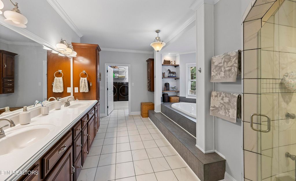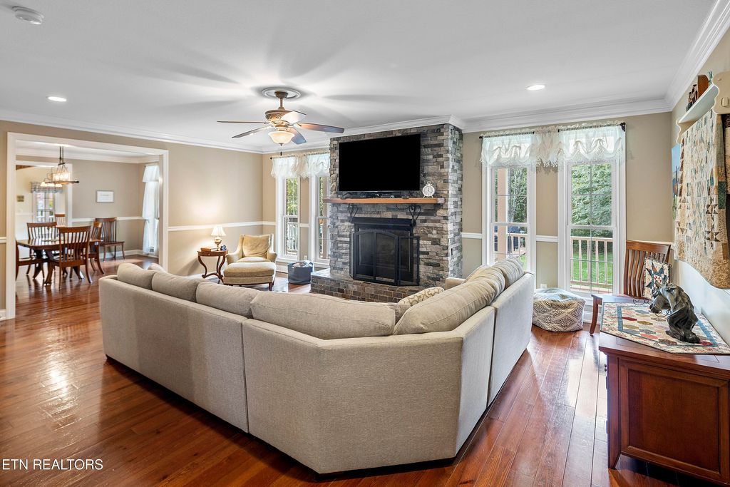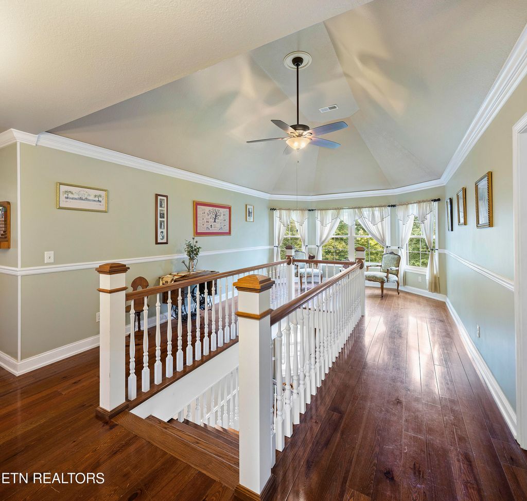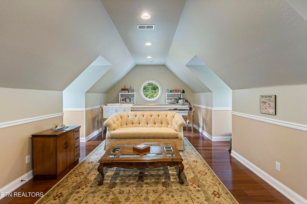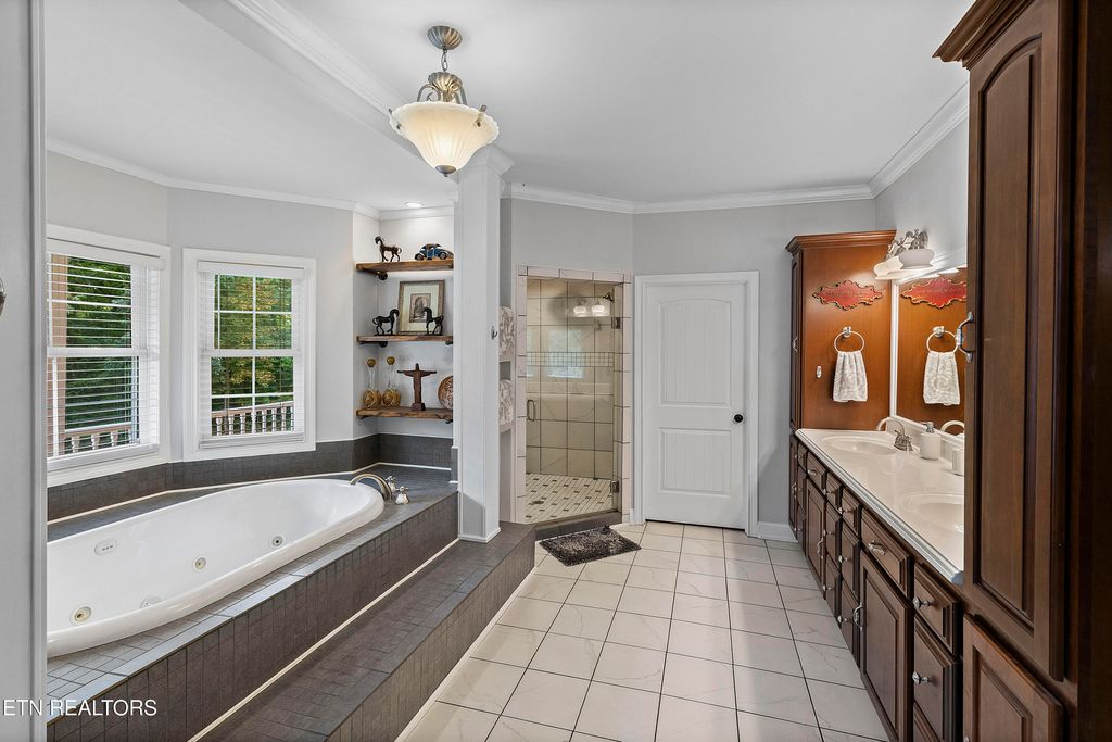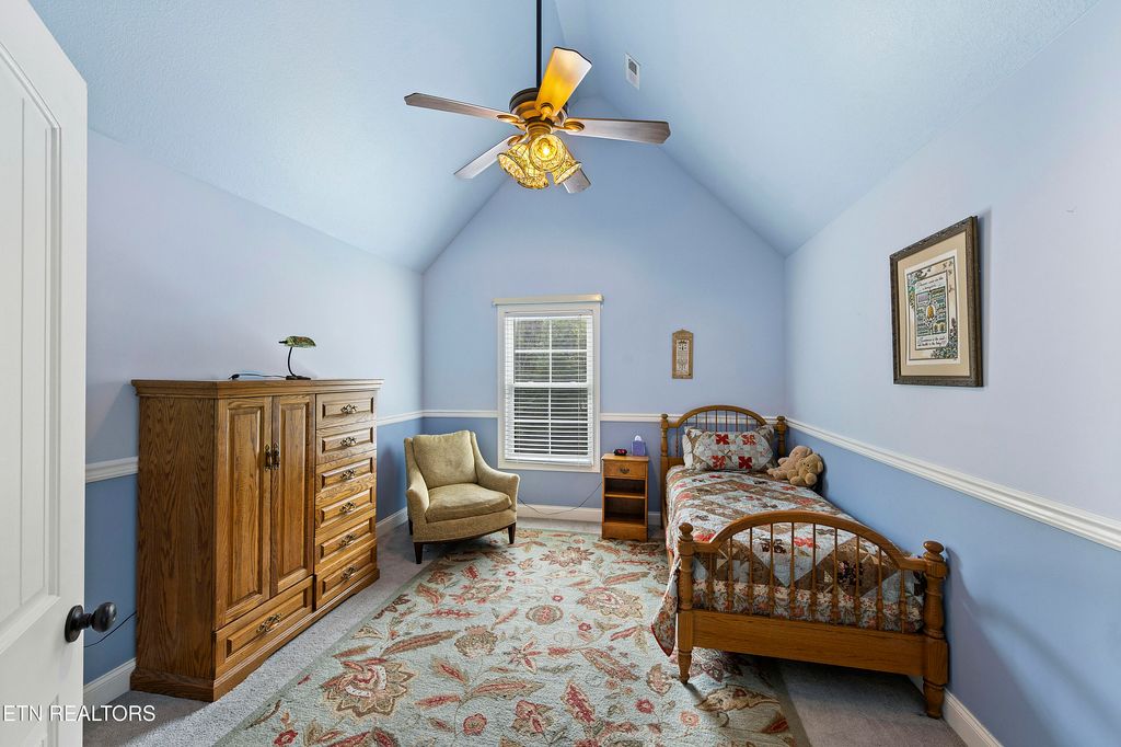 This sprawling estate located in a private, gated community rests on five rolling acres in a beautiful, park-like setting. Upon entering the property, the circular drive is gracefully landscaped and outlined with Crepe Myrtles. A true Southern Living type property with over 4,900 sq ft, 5 bedrooms, 4.5 baths and a wrap-around porch that surrounds the entire home. A desirable layout with both the primary and a private guest ensuite located on the first level, opening multiple options for living quarters. The spacious living room features a stacked stone fireplace, gleaming hardwood floors and French doors leading to the back porch. The chef's kitchen is the heart of the home and an entertainer's dream. Showcasing a grand oversized island, abundant custom cabinetry, upscale appliances and decorative wood beams, that create a welcoming gathering place for family and friends. The upper level includes three generous-sized bedrooms and a versatile bonus room, with the added benefit of a second laundry room. For the creative enthusiast, a custom-built craft room with its own exterior entrance provides the perfect space to work on your next masterpiece. Escape to the back-yard private oasis that awaits ultimate relaxation and entertaining. A pristine, heated, saltwater pool with sun shelf is a summer-time favorite. The recently updated, expansive, poured concrete patio with pergola is ideal for large gatherings. Enjoy a relaxing evening by the fire at the nearby fire-pit. The detached three-bay garage offers over 900 square feet of immaculate, climate-controlled space for vehicles and hobbies. Walk-up, floored attic space above provides limitless storage or space for a work-out station. An additional detached workshop/storage building offers generous space for equipment. The property features an invisible fence and a separate, fenced area off the side porch for pets. Experience the ultimate blend of peaceful serenity and vibrant convenience. Located within close proximity of Maryville, Lenoir City, and Knoxville, you'll have effortless access to shopping, dining, and entertainment. Outdoor enthusiasts will find the Great Smoky Mountains National Park and nearby lakes just a short drive away for hiking, biking, horseback riding, and water sports. This unique location offers the best of both worlds. A truly exceptional property!