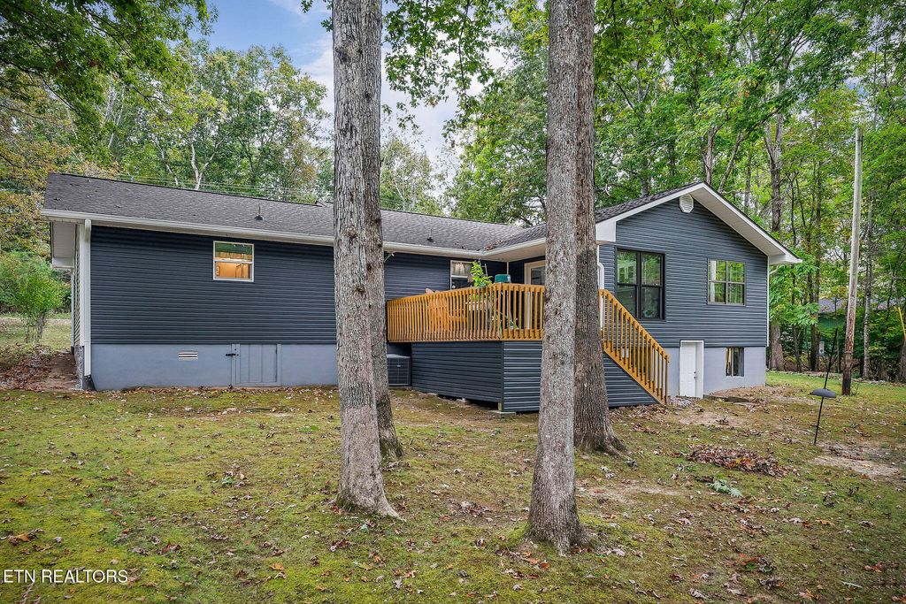 Enjoy privacy and beauty the moment you arrive"”this home is tucked behind blooming Rose of Sharon bushes and surrounded by meticulously maintained landscaping, complete with a tranquil waterfall feature near the front porch. The covered porch is rocking-chair ready with a ceiling fan, perfect for relaxing evenings. The exterior shines with brand-new dark blue vinyl siding accented by stone veneer, new windows, new deck in 2023, newer roof and new gutter guards.