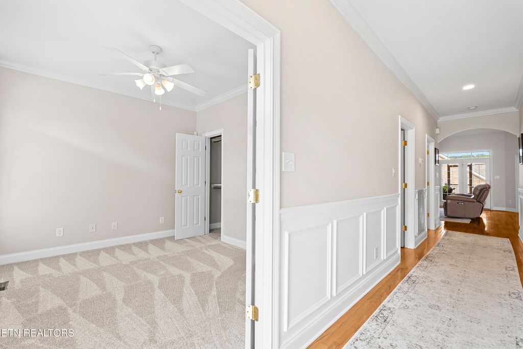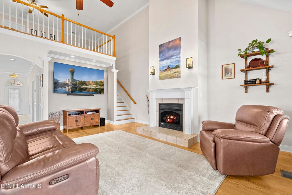 A covered front porch ushers you inside, where hardwood floors open into a flexible space ready to serve as a bedroom or office. Beyond, the family room rises with vaulted ceilings, a gas fireplace, and refined details throughout the home including archways, crown molding, plantation shutters, top-down/bottom-up shades, recessed lighting, wainscoting, and more! The family room is spacious enough for multiple arrangements and includes a floor outlet for lamps and a mounted TV that conveys.