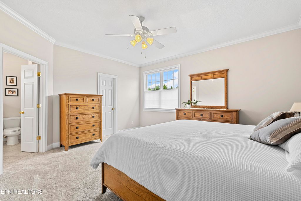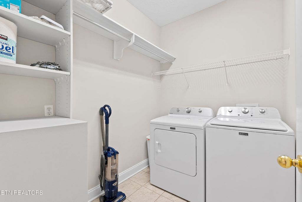 The main-level master suite is spacious enough for substantial furniture and features his-and-hers closets, both outfitted with custom storage systems. The ensuite bath is a sanctuary with double sinks, comfort-height vanity, soaker tub, tiled walk-in shower with bench, and tiled floors. A full laundry room with tile flooring rounds out the main level.