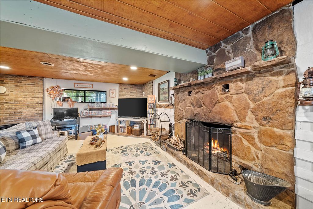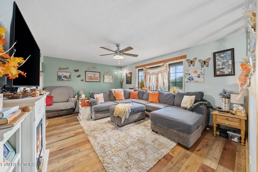 Recent updates include new wood laminate flooring, fresh paint throughout, a metal roof installed in 2024, and an HVAC system (2 years old) with natural gas heat. The home features a stone fireplace with gas logs, a gas range (3 years old), and public water with an Osmosis filtration system.