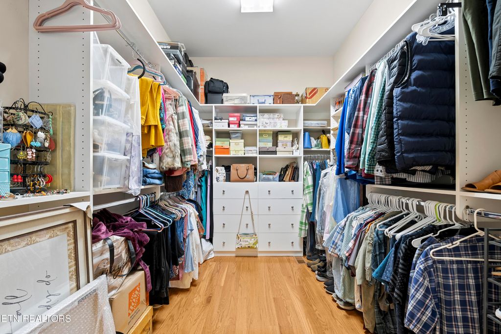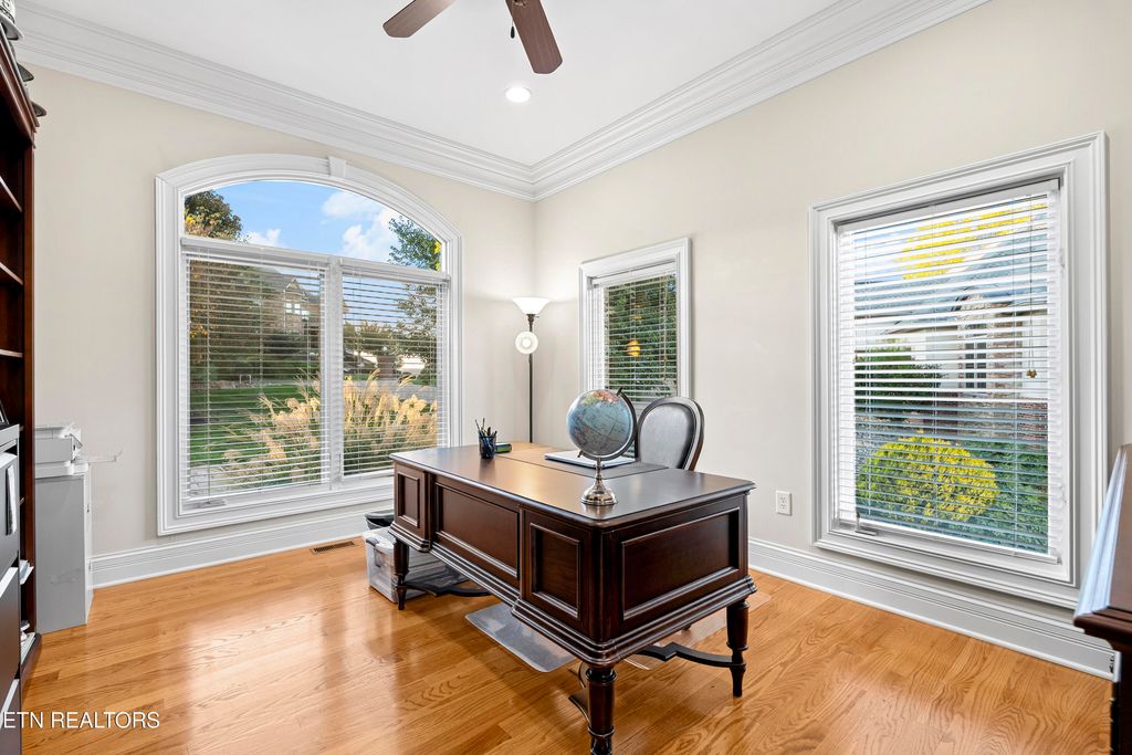 The main level features hardwood floors throughout, including the primary suite with a tile and glass shower with multiple showerheads, dual vanities, and a large walk-in closet. A main-level office/study can also serve as a fifth bedroom.