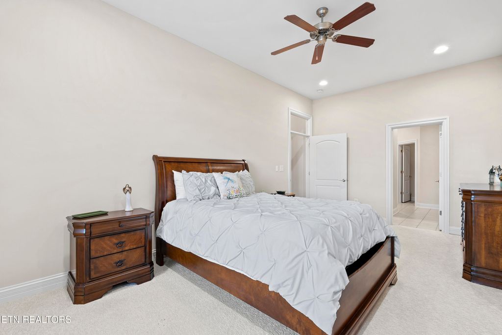 The lower level includes three private ensuites, each with its own bath and walk-in closet, a second living area with gas fireplace, full kitchen, and laundry with sink. Additional features include a home gym/rec room, beautifully landscaped yard, and a separate golf cart garage.