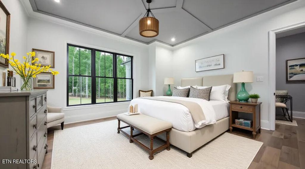 The split-bedroom layout ensures privacy, with the primary suite occupying its own wing. The vaulted owner's retreat includes a spa-inspired bath with dual vanities, a soaking tub, walk-in shower, and an expansive 10'10'' x 14'2'' walk-in closet with direct access to the laundry room. Across the home, three additional bedrooms share two full baths, including a convenient Jack-and-Jill. Upstairs, 698 square feet of flex space above the 3-car garage offers endless possibilities"”guest suite, media room, or hobby studio. With its thoughtful design, luxurious features, and peaceful estate setting with seasonal mountain views, this Modern Farmhouse is the perfect place to create your dream home.