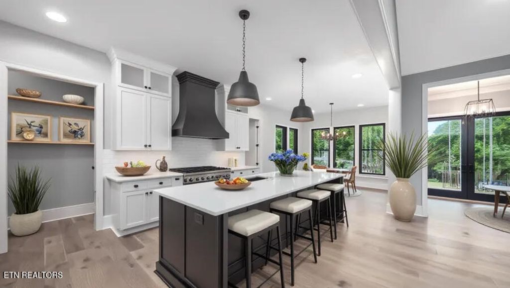 The chef's kitchen offers a large center island, premium finishes, and seamless flow into the dining and living areas, while the private home office"”tucked just off the foyer behind sliding barn doorsprovides a quiet space with peaceful front porch views.