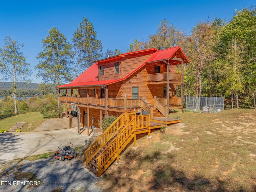 Experience East Tennessee living at its finest in this FULLY FURNISHED, custom-built log home across the street from beautiful Watts Bar Lake. Perfectly situated on 16.03 partially wooded acres, this property offers both privacy and unmatched lake and mountain views.