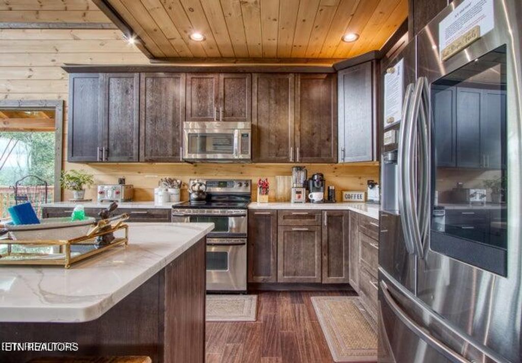 Sitting atop the highly sought area of Chalet Village, this nearly 4,000 square foot custom build LUXURY property has it all- from the AMAZING panoramic views of Gatlinburg mountains and valleys to its elegance of fine nature living! Upon arriving, homeowners and guests will be taken back by the breathtaking fine details that have went into its craftmanship through the BEAUTIFUL wooden/hand carved front entryway door after soaking up all the curb appeal from the professional landscaping to its wraparound decks, the lucky owners will surely have a difficult time with their new decision of whether to keep this gem for themselves or to continue its SIX figure yearly income! Once inside, marvel at the vaulted ceilings and one-of-a-kind stacked stone gas fireplace before enjoying the charm radiating from the kitchen with its stainless-steel appliances that scream out, COOK-IN and entertain vs that night out that can wait to enjoy all that living only minutes from downtown Gatlinburg as to offer! While staying grounded at your resort, which will produce hours upon hours with its at-home THEATRE or outdoor decking that leads to soaking in the hot tub while enjoying the stars overhead or retreat and soak with the indoor jacuzzi tub. Ownership of this resort will also include for you and all your guests, all of the mainstream perks of having its clubhouse proximity with tennis courts, pools, trails, or other recreation that see fits.... perhaps, the basketball court instead! This newly built cabin, boosting 3 bedrooms / 4 bathrooms & an added space for additional guests, surely will NOT last long so schedule that showing today before it becomes just a pipe dream to own this level of FINE LUXURY MOUNTIANTOP LIVING!!