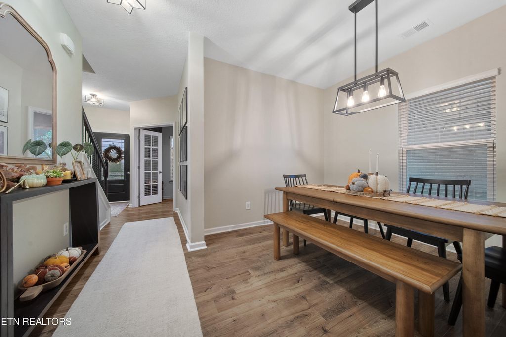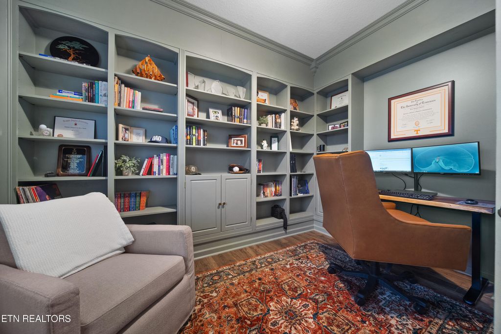 The main level features luxury vinyl plank flooring throughout, a separate formal dining room, and a dedicated office with French doors, crown molding, and custom built-in cabinetry and shelving"”ideal for remote work or study. The heart of the home is the open-concept living room and eat-in kitchen, which boasts granite countertops with an island, stainless steel appliances, gas range, walk-in pantry, and an under-sink reverse osmosis system with instant hot water tap. A separate laundry room with cabinets is conveniently located just off the kitchen.