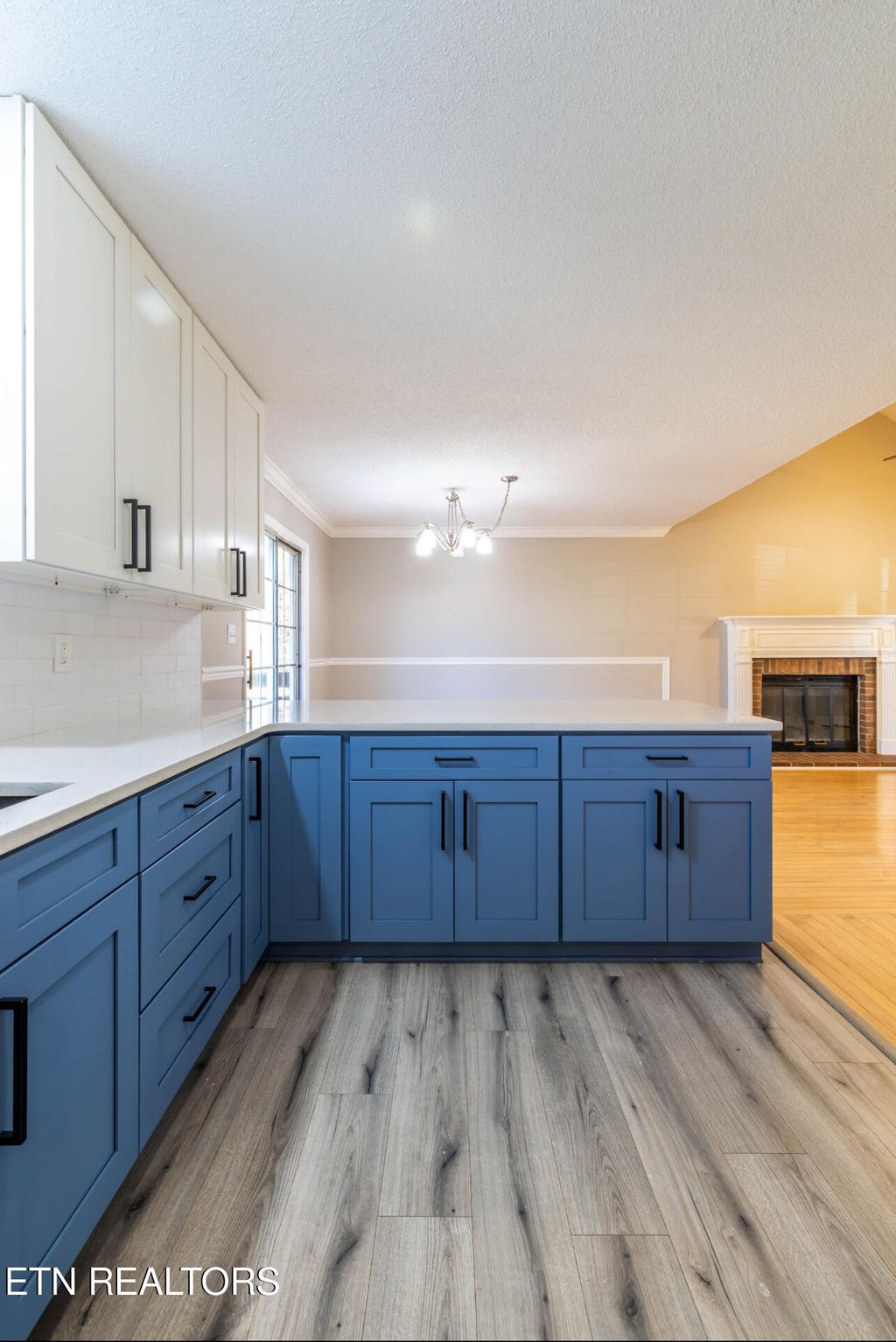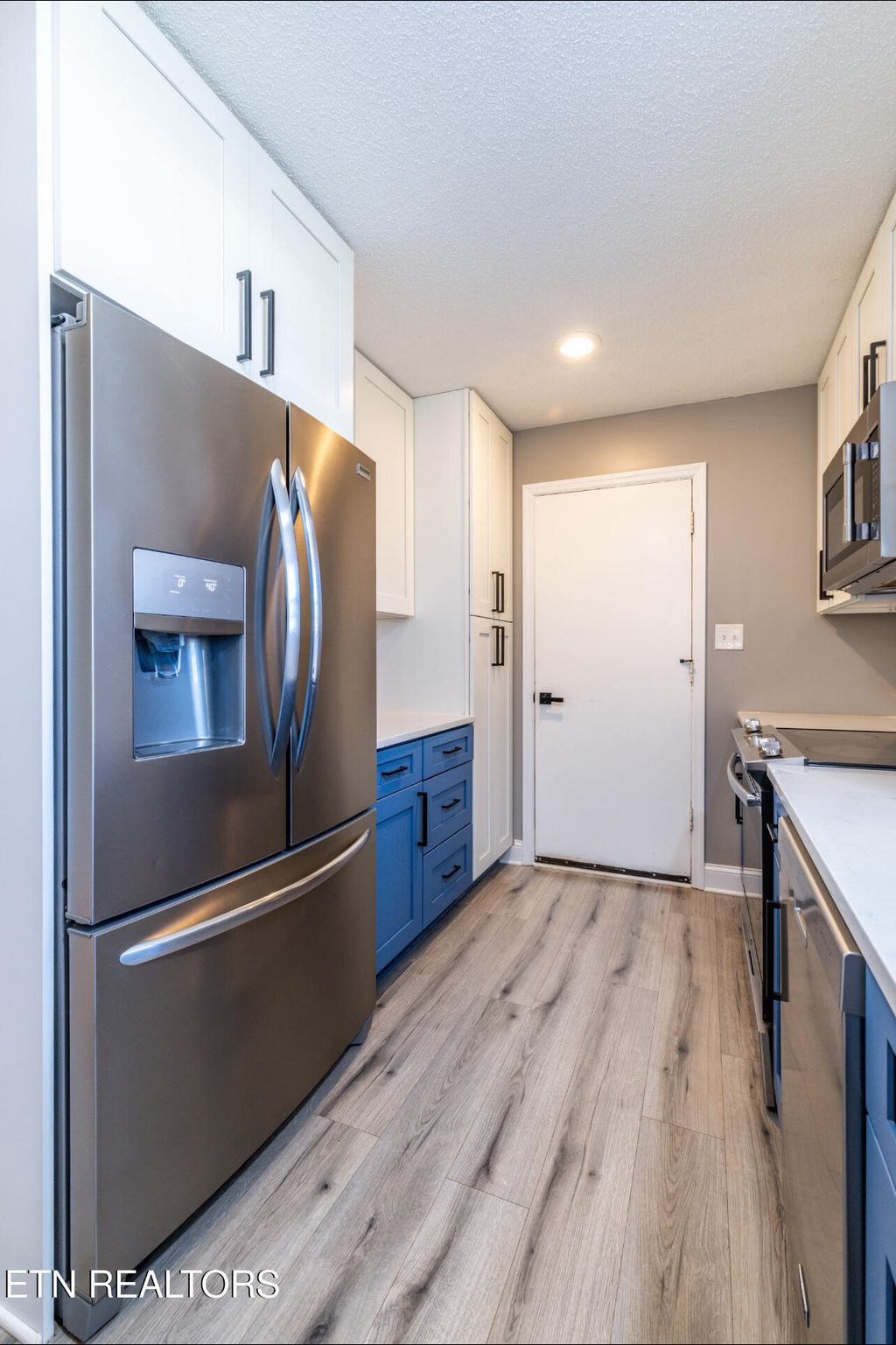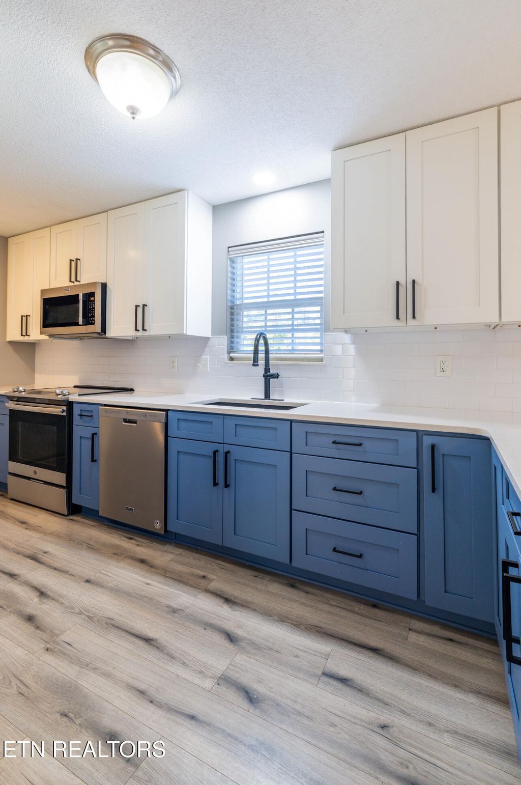 NEWLY renovated kitchen features navy and white cabinetry, stainless steel appliances, and modern finishes that bring together style and everyday function. The main level has real hardwood floors, while the kitchen and upstairs feature brand-new laminate. Both staircases, leading to the upper level and the basement, have been updated with new wood treads and railings, adding a clean, cohesive finish throughout.