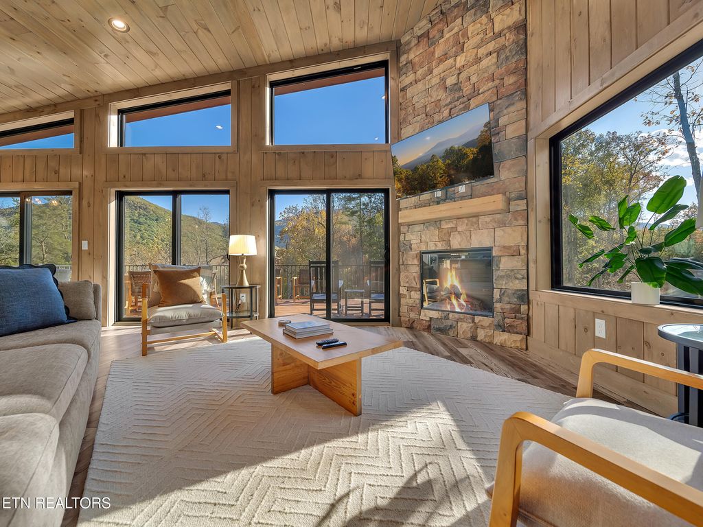 Step inside to an open-concept great room where soaring vaulted ceilings and floor-to-ceiling windows frame the surrounding mountain vistas. A striking stone fireplace anchors the space, creating a perfect gathering point for quiet evenings or lively entertaining. The gourmet kitchen features an island, custom cabinetry, and granite countertops, blending luxury and functionality for both everyday living and hosting guests.