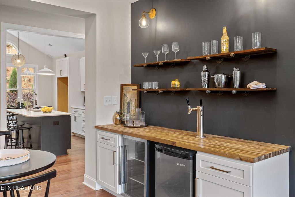 The adjacent gourmet kitchen features quartz countertops, GE Monogram appliances, a pantry with a barn-door accent, and seamlessly opens to a dining area complete with a built-in wine bar and tap - an entertainer's dream.