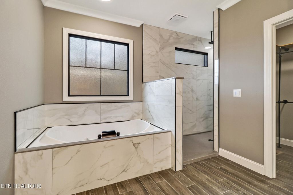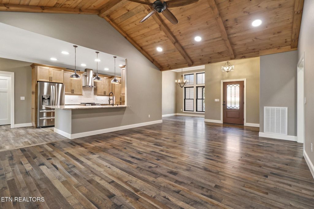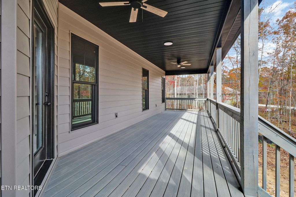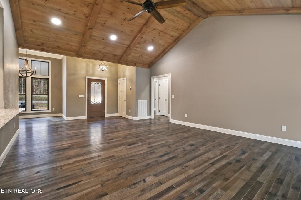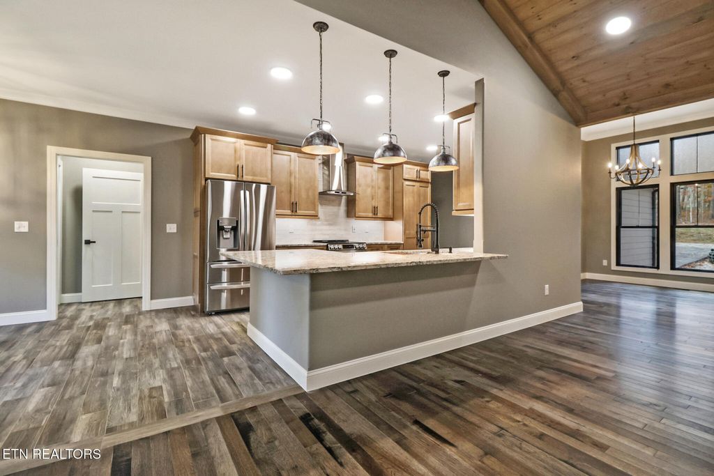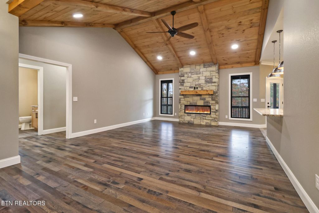 New construction, beautifully crafted 4-bedroom, 2-bath residence nestled in the serene landscape of Fairfield Glade. This thoughtfully designed home blends rustic charm with modern sophistication, offering comfort, functionality, and timeless style. Exterior & Curb Appeal: From the moment you arrive, you'll be captivated by the home's stone and board-and-batten façade, accented by rich wood shutters and gable details. A stamped concrete driveway and sidewalk add an elegant touch and low-maintenance durability. Interior Highlights: Step inside to a bright, open living area featuring beautiful hickory wood flooring and vaulted wood ceilings with exposed beams. The stone fireplace serves as a stunning centerpiece, creating the perfect setting for cozy evenings. Large Weather Shield windows flood the home with natural light and offer energy efficiency throughout. Kitchen: The gourmet kitchen showcases granite countertops, custom cabinetry, and high-end LG and Bosch stainless steel appliances. A spacious walk-in pantry adds convenience and extra storage. Primary Suite: Relax in the primary suite featuring tray ceilings, large windows, and ample space for a sitting area. The ensuite bath includes a soaking tub, walk-in tiled shower, and dual vanities, creating a private spa-like retreat. Bedrooms 2 & 3: Split bedroom design with two guest bedrooms on the opposite side of the home with large closets and a guest bathroom between them. Bonus Space: Upstairs, a versatile bonus room or fourth bedroom includes its own mini-split HVAC system, ensuring year-round comfort and efficiency"”perfect for a home office, guest suite, or media room. Additional Features: Laundry/mudroom with built-in shelving, utility sink, and workspace, and covered back deck with ceiling fans, ideal for enjoying the peaceful wooded surroundings. This home combines elegant finishes, modern systems, and quality construction in a beautiful natural setting.