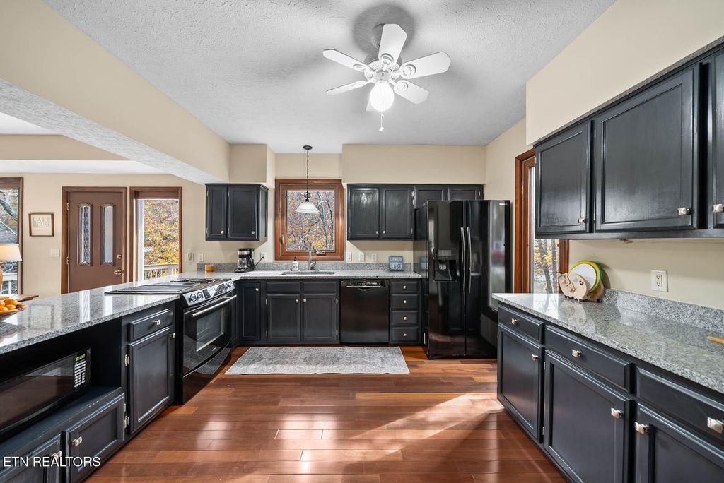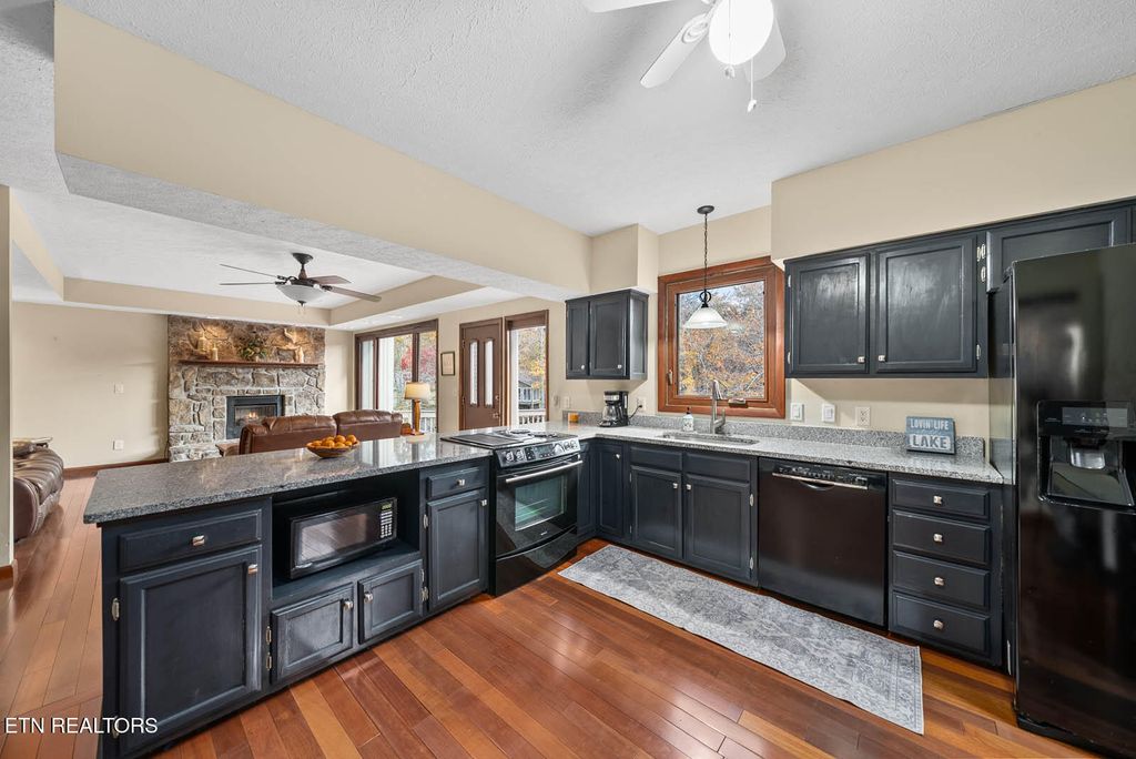 The main level showcases Brazilian wood floors, granite countertops, and a natural stone gas fireplace (currently not connected). The downstairs bedroom serves as the primary suite, complete with a full bath and walk-in shower. Upstairs, you'll find two large bedroom suites, each with its own full bath and access to a covered porch "” the perfect spot to enjoy morning coffee among the treetops, truly capturing that ''treehouse on the lake'' feeling.