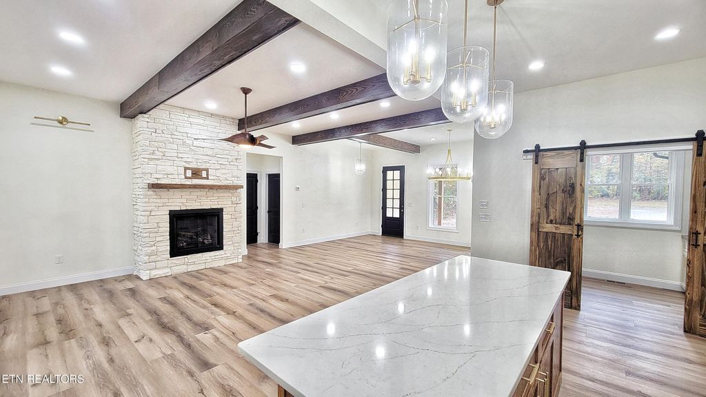 The covered back deck includes a gas line setup for a grill and an upgraded ceiling fan. Gas service is already run to the home, allowing easy conversion. The custom exterior stonework further sets this property apart, elevating its curb appeal and reflecting the same attention to craftsmanship found inside.