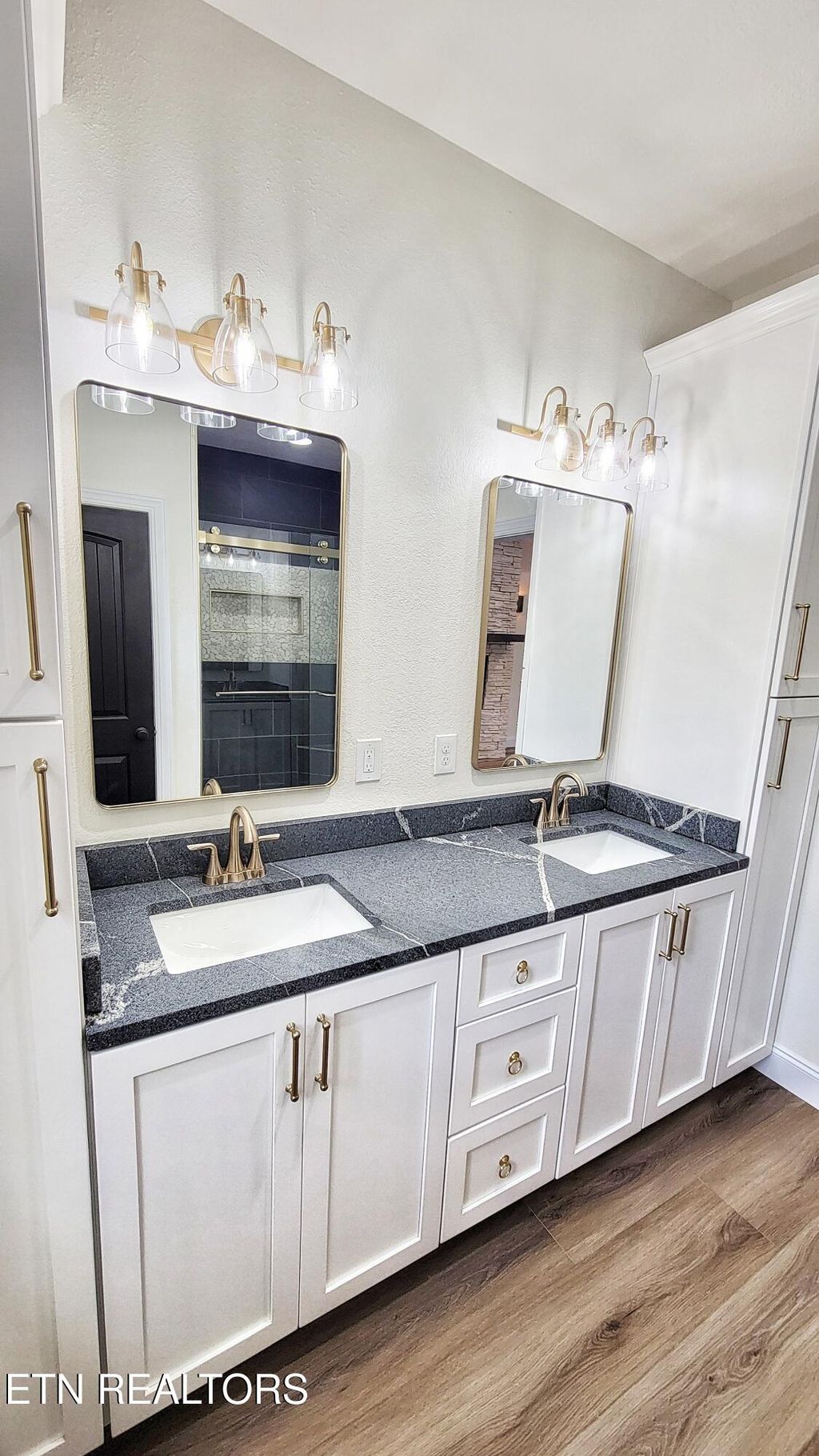 The main suite is luxe, designed with both comfort and sophistication in mind, can accommodate a king bed with space to spare, the room features large picture windows that fill the space with natural light and a stacked-stone fireplace that adds warmth and character. Premium custom wall lighting anchors the fireplace, perfect for those who prefer soft, directional light over overhead fixtures, and includes dimmer and control switches for a fully adjustable ambiance. The ensuite bath is timeless with Black Forest honed granite countertops, brushed gold and champagne fixtures, soft-close cabinets and drawers, and curated old-world handles chosen to ensure the design remains classic for years to come. The walk-in shower showcases a stone mosaic tile floor, an accent wall with a built-in gold-trimmed shower nook, and cohesive detailing that elevates the entire space. The custom wood closet continues the luxe experience with full built-in organization, down rods for added accessibility, and premium craftsmanship that reflects the home's overall commitment to quality and long-term value.