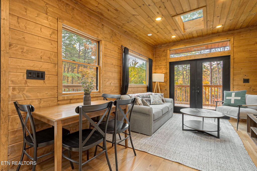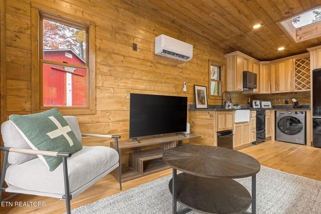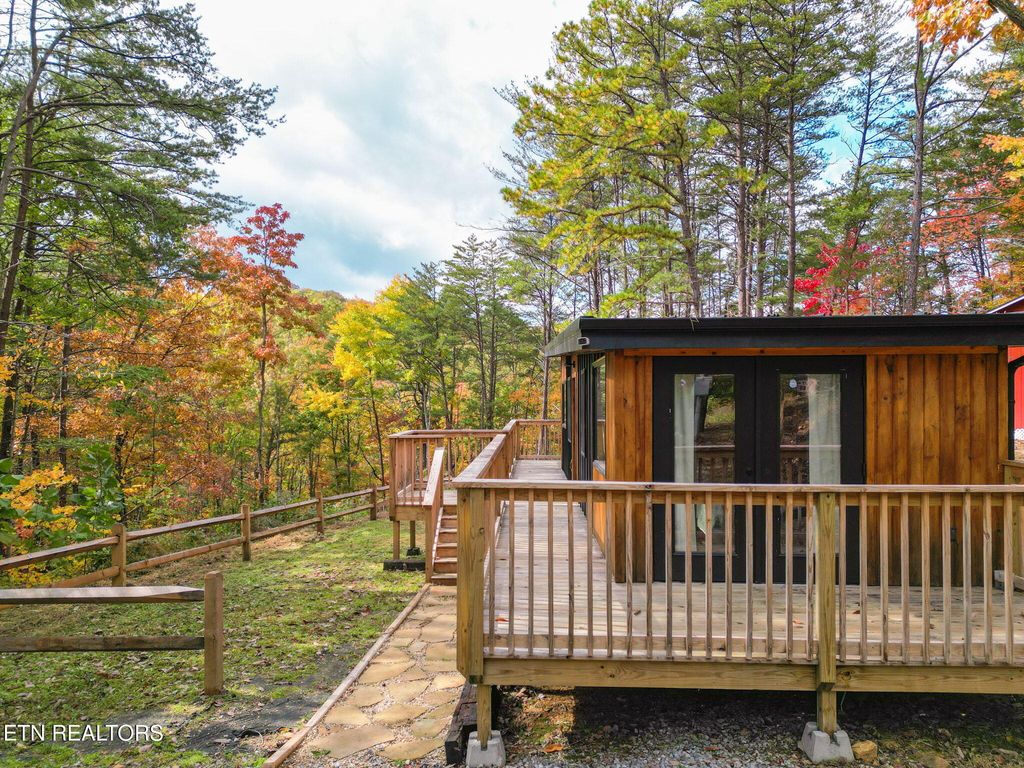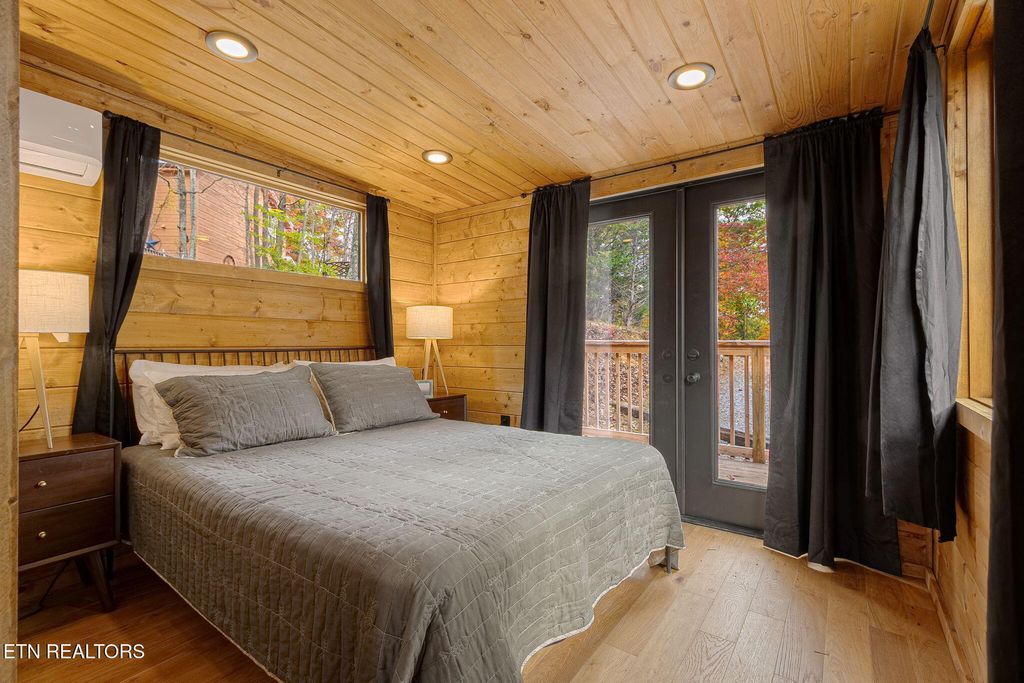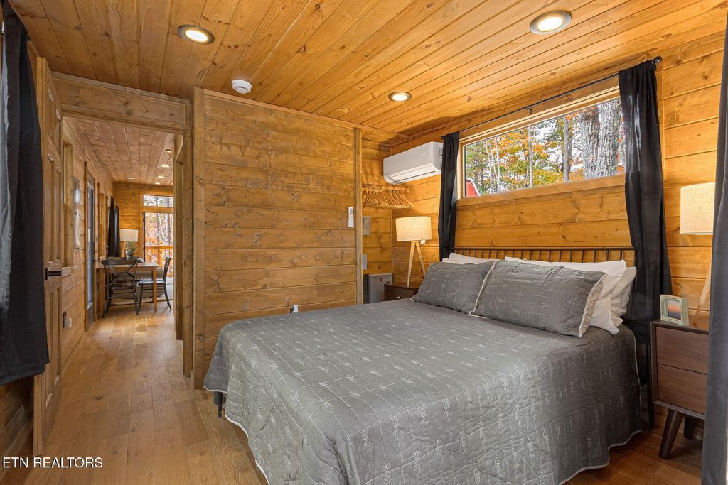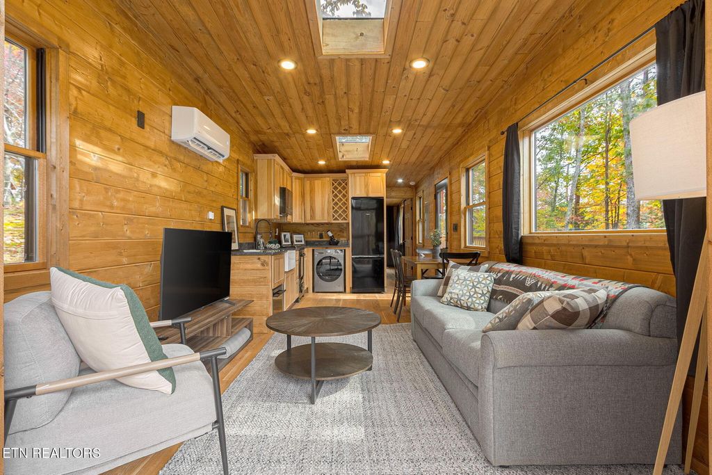 Nestled within the beautiful Wears Valley area of the Great Smoky Mountains, this newly constructed, turn-key-ready, modern one-bedroom tiny cabin is a captivating fusion of contemporary design and rustic charm. Its sleek, minimalist exterior seamlessly blends with the lush natural surroundings, while the interior showcases a masterful design that marries modern elegance with rustic warmth. Skylights highlight the rich tongue and groove walls, immersing the space in an abundance of natural light and offering exquisite views of the ever-changing sky above.