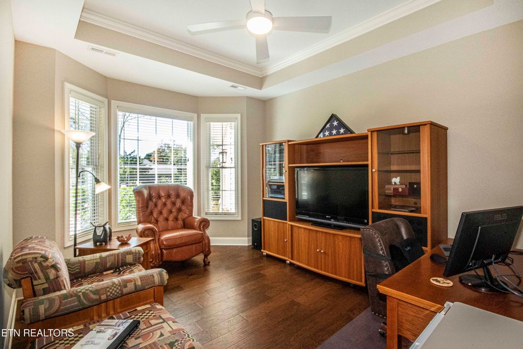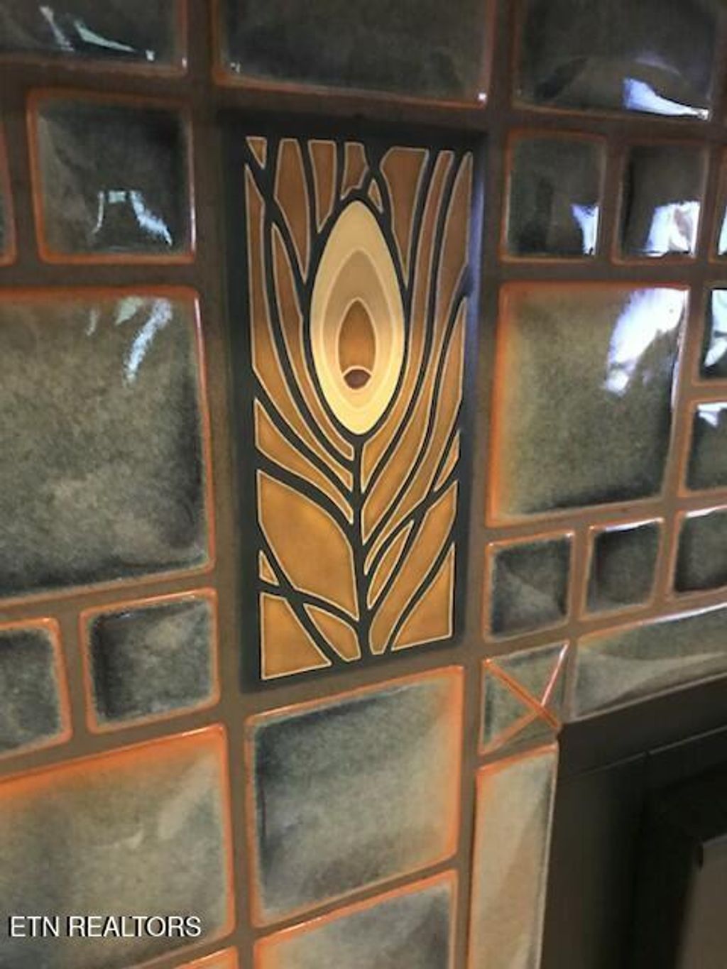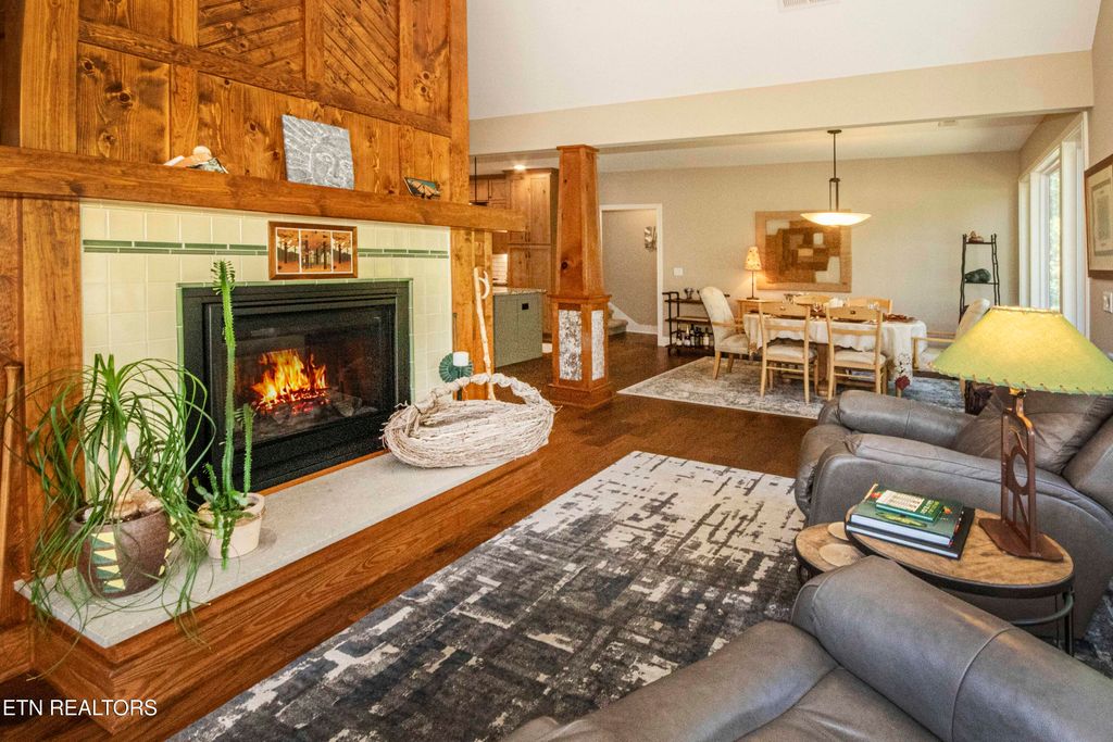 Set along the 12th fairway of the Kahite Golf Course in beautiful Tellico Village, this unique 2,897-square-foot home blends craftsmanship, comfort, and the serenity of nature into a space that feels inviting from the moment you step inside. Designed to bring the outdoors in, the home's natural elements create a relaxed feel. The centerpiece of the great room is a breathtaking two-story, double-sided Southern pine fireplace adorned with handcrafted Motawi tiles and flanked by custom built-in bookcases. It serves as both a work of art and a gathering space dividing the great room and the sunroom while filling both with a sense of warmth and timeless charm. Just off the main living area, corner-mounted sliding wood doors offer the flexibility to close off the den/office for privacy, a functional architectural feature that enhances and provides privacy.