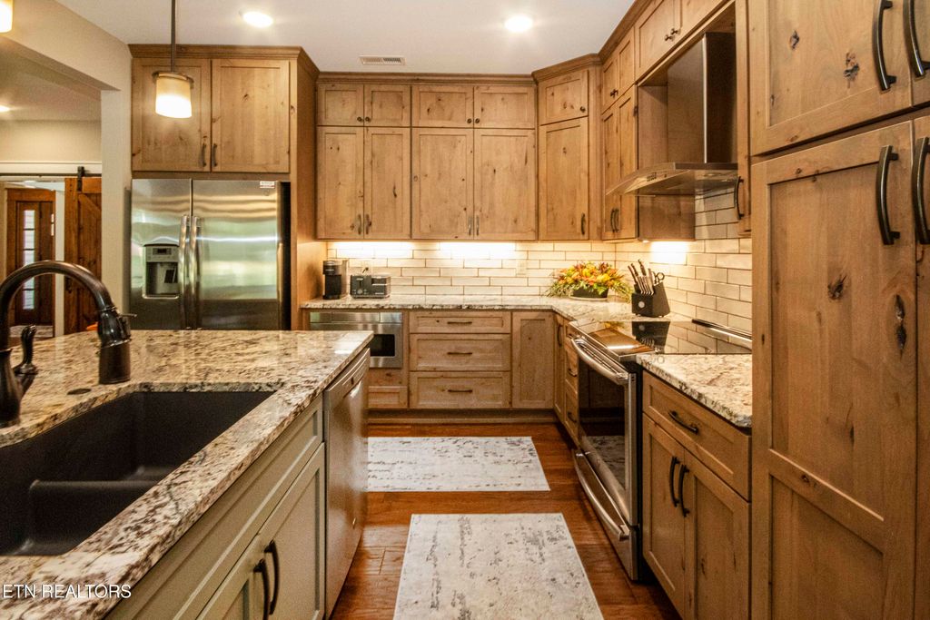 The kitchen is equally inspired, featuring custom knotty alder cabinetry, a large center island, granite countertops, and a tasteful tile backsplash that complements the home's natural palette. Whether entertaining or enjoying a quiet morning coffee, the open flow to the living areas and the natural light from the sunroom make it an ideal space for connection and comfort.