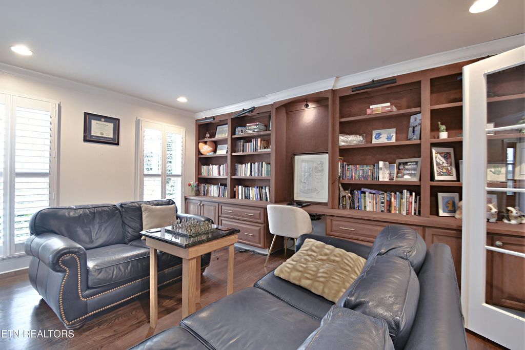 The main level features striking architectural details, including a stack stone wall in the great room and a stunning dedicated home office with built-in cherry cabinetry.